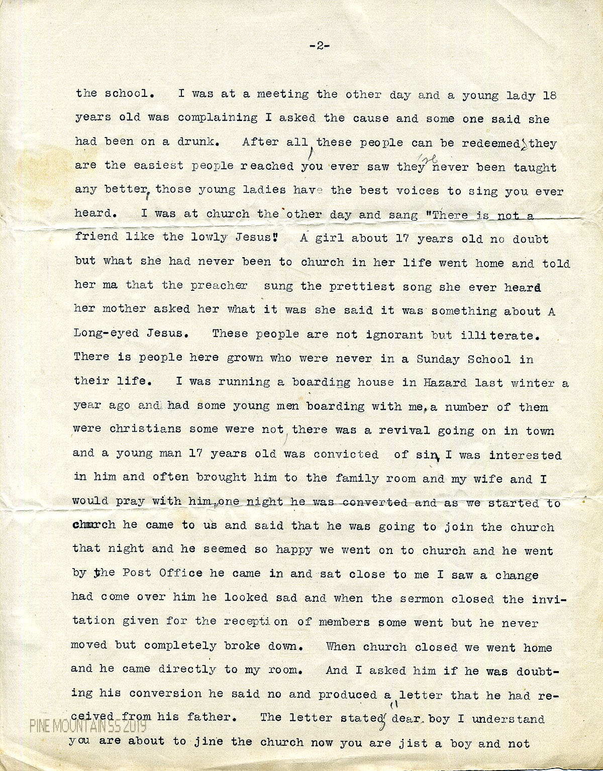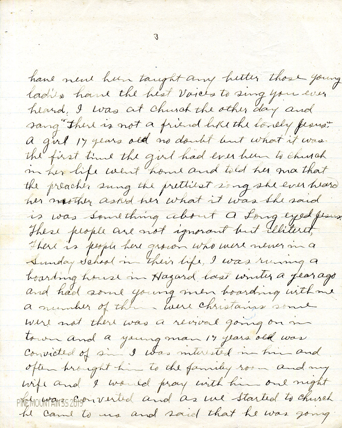 These people are not ignorant but illiterate. There are people here grown who were never in a Sunday School in their life. I was running a boarding house in Hazard last winter a year ago and had some young men boarding with me. A number of them were Christians. Some were not. There was a revival going on in town and a young man, 14 years old, was convicted of sin. I was interested in him and often brought him to the family room and my wife and I would pray with him. One night he was converted and as we started to church he came to us and said that he was going…