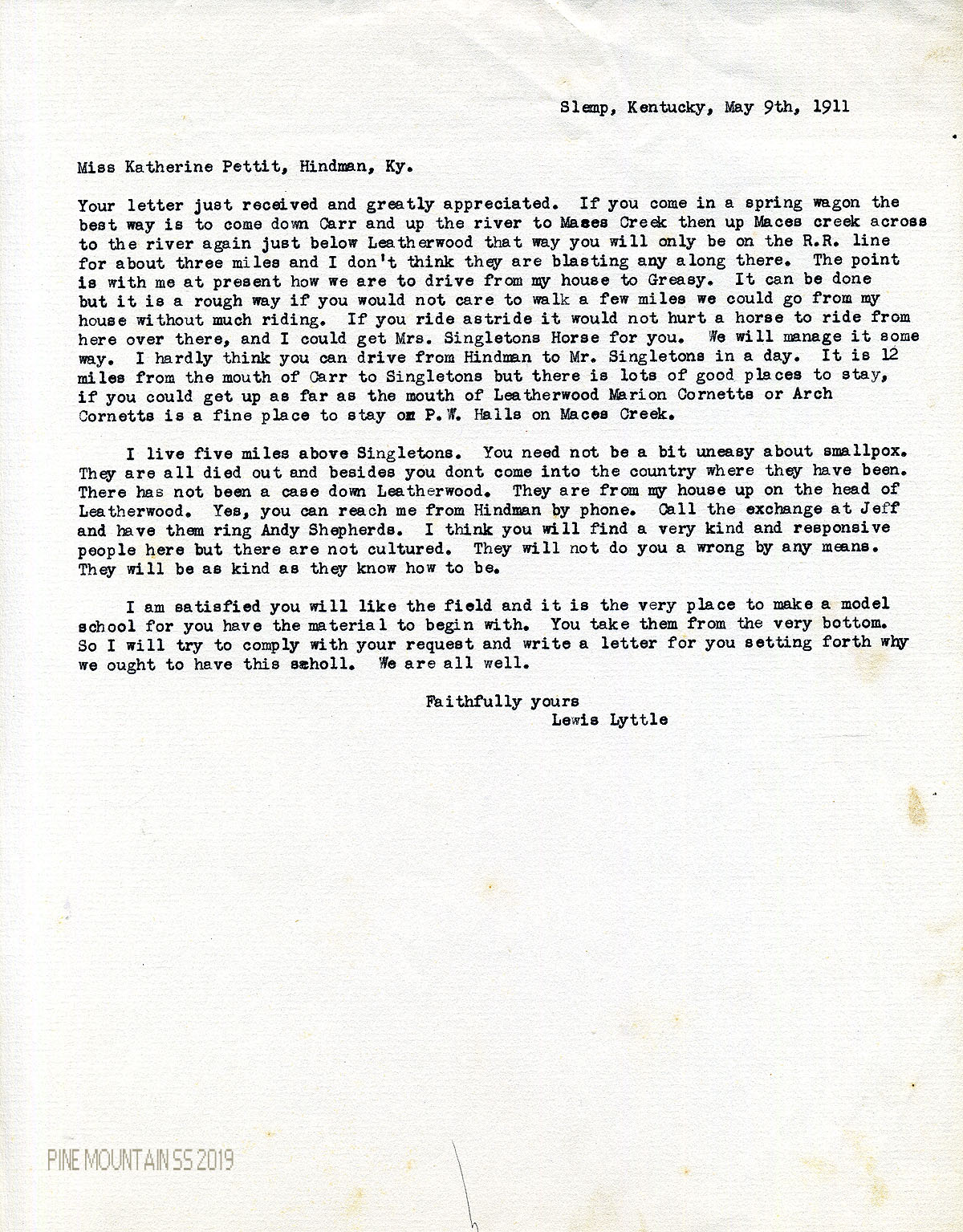 In the early 1900s, Rev. Lewis Lyttle served as a liaison between Katherine Pettit and the community to find those who would donate suitable land on which to build a new settlement school. When Lyttle wrote the following letters, the idea of a school in the Pine Mountain Valley was just beginning to form in the minds of Lyttle and Pettit. The timing was fortuitous and both Lyttle and Pettit began to energetically work toward making the vision a reality.