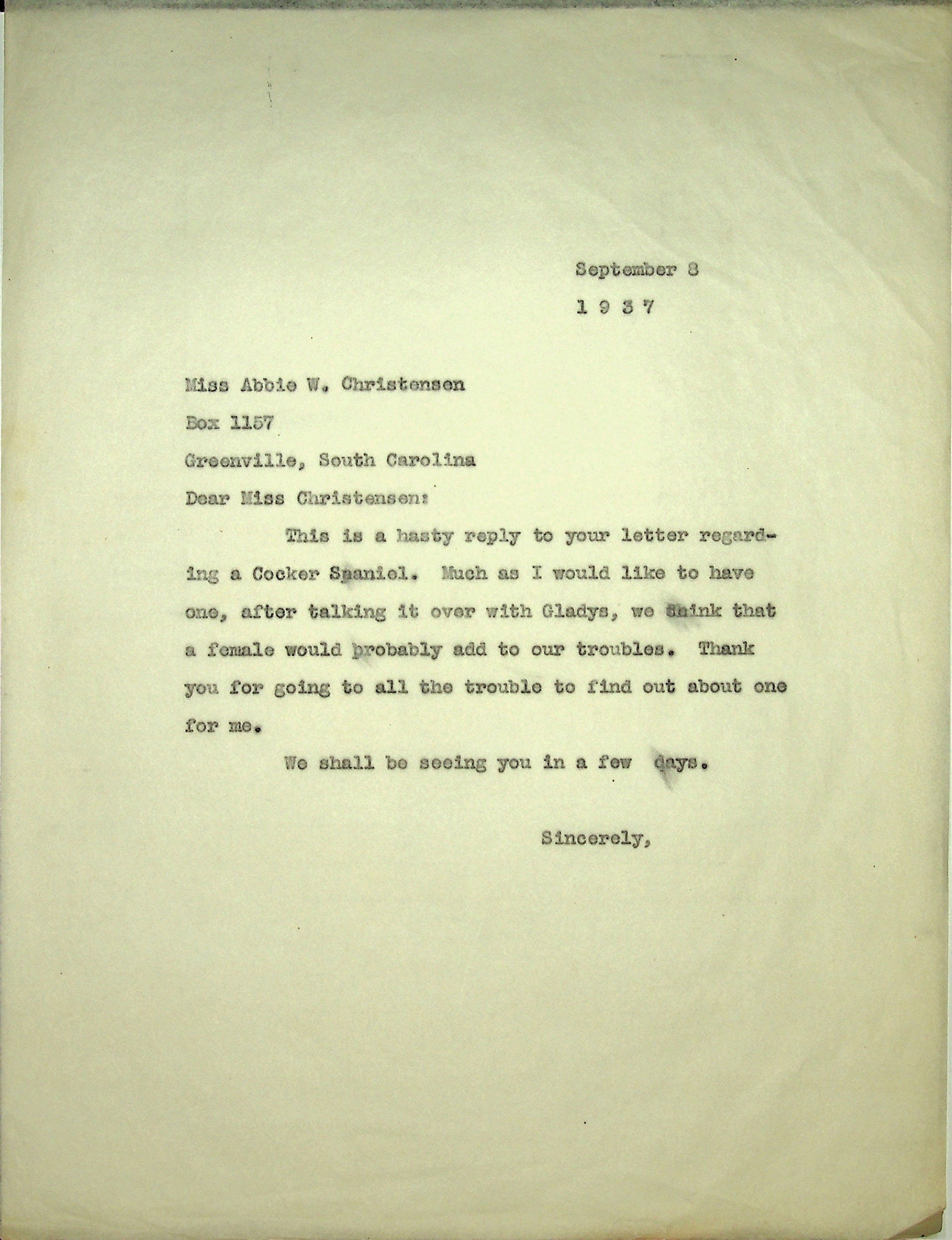 September 8, 1937. To Abby W. Christensen in Greenville, SC from [unsigned, likely Glyn Morris]. Declines offer of a cocker spaniel.