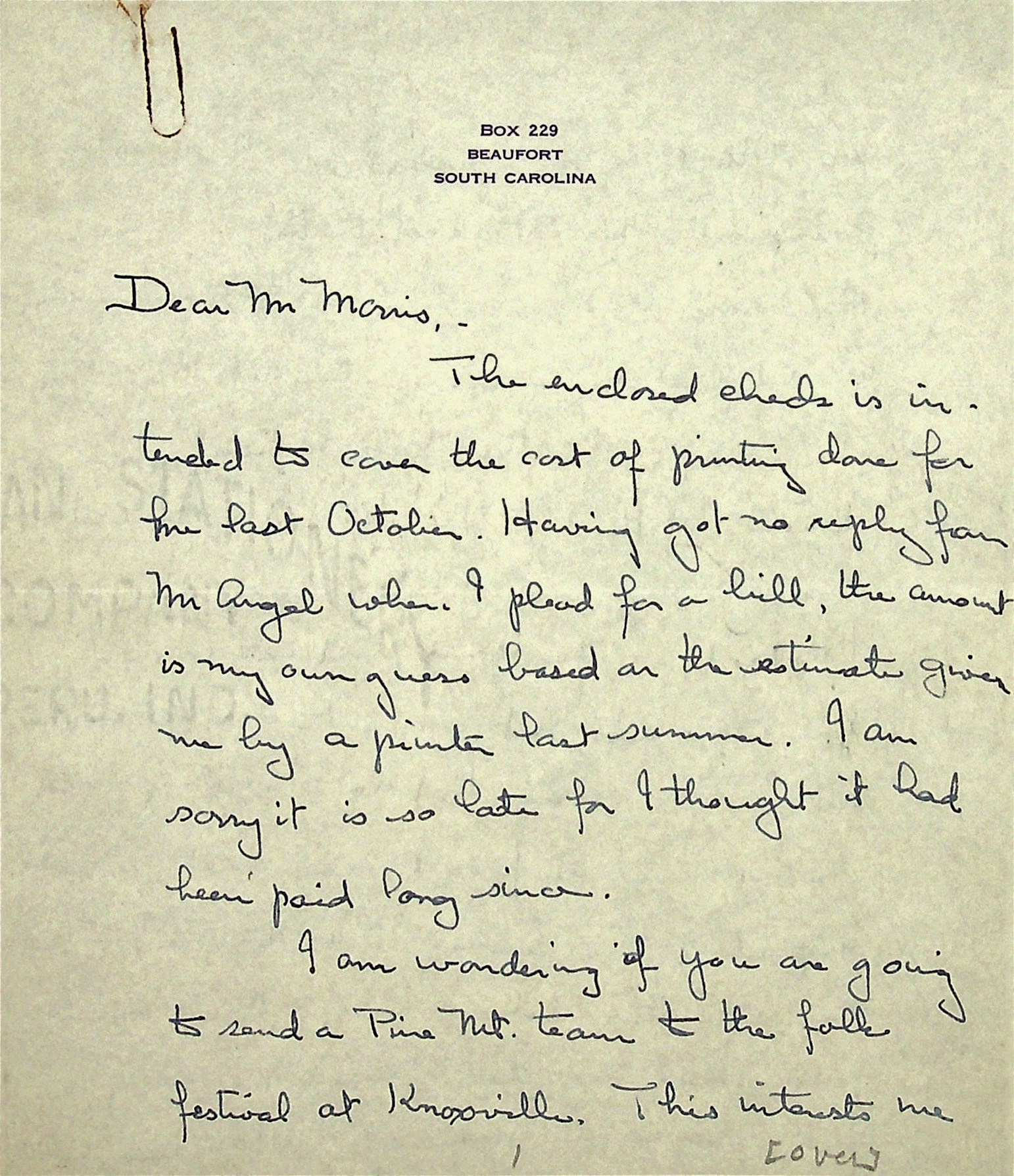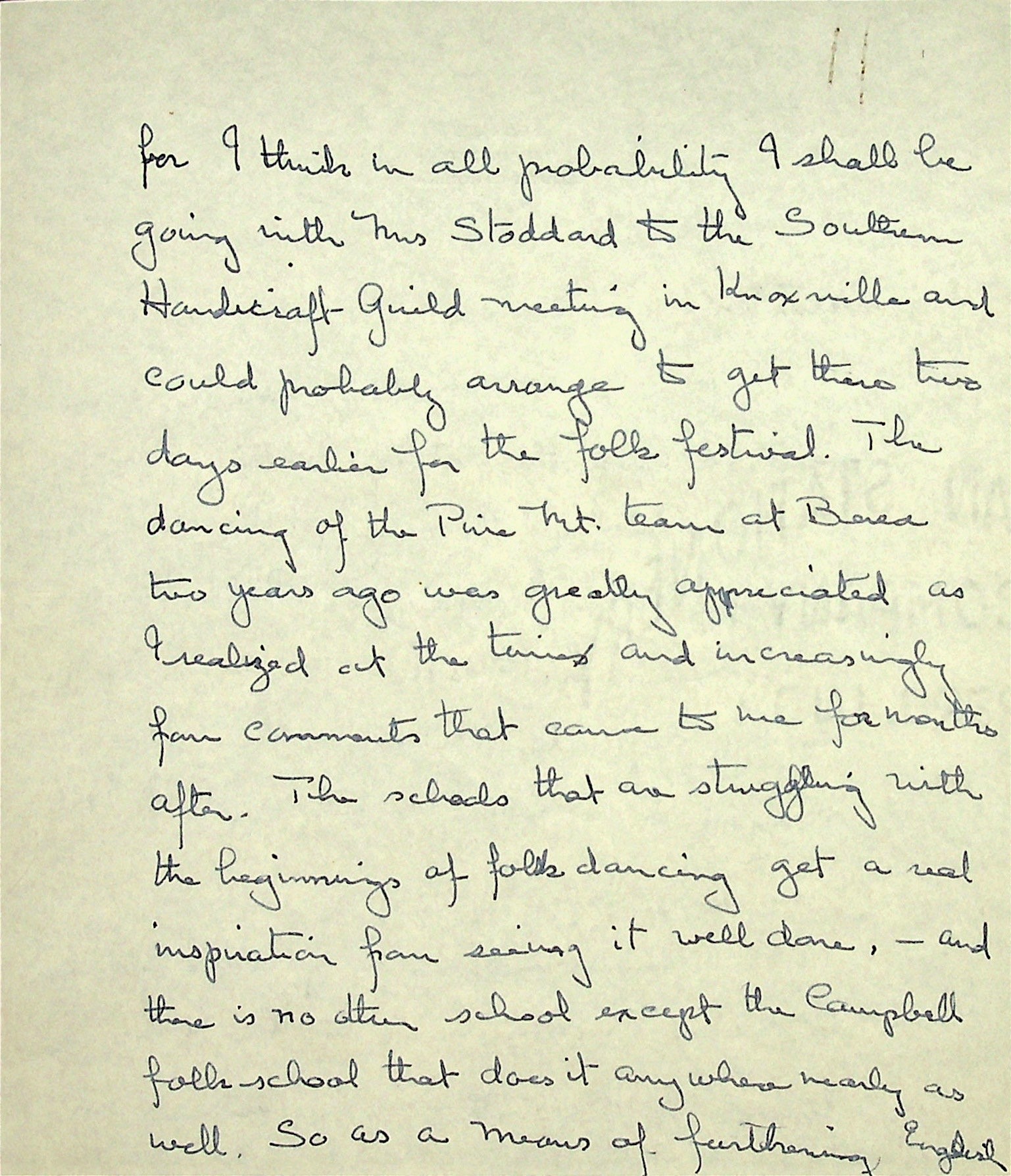 March 4, 1937. To Morris from Christensen. Concerning the program for the Knoxville Folk Festival, “…when a Pine Mt. team goes to meet other dance teams at a folk festival it represents not only Pine Mt. but also English folk dancing as passed on by me.” Comments on upcoming May Day.