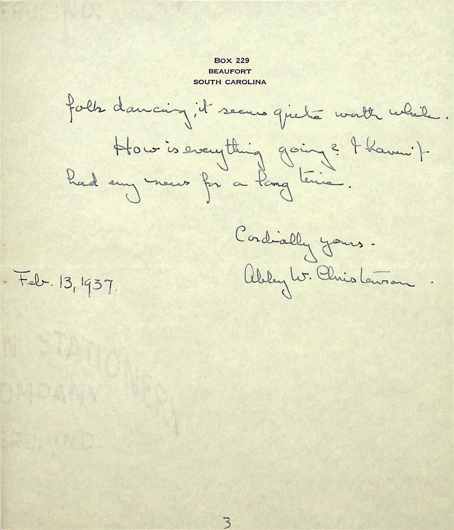 TAGS: Abby Winch Christensen Correspondence 1937, English Country Dance, dancing, Beaufort SC, Greenville SC, folk festivals, May Day