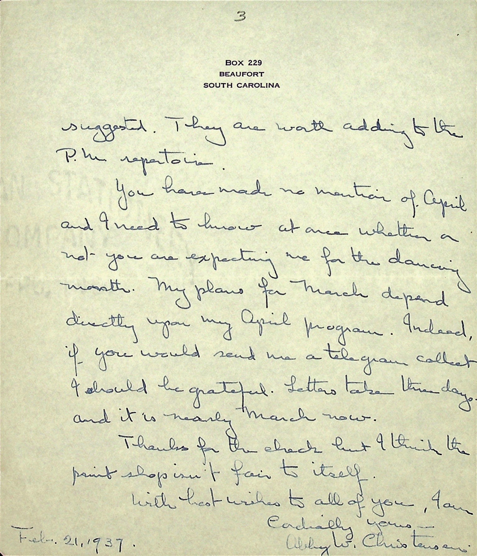 February 21, 1937. To Morris from Christensen. Asks for details & provides suggestions about the Pine Mt team’s plans to attend the Knoxville Folk Festival. Asks if she’s expected for the “dancing month (April).”
