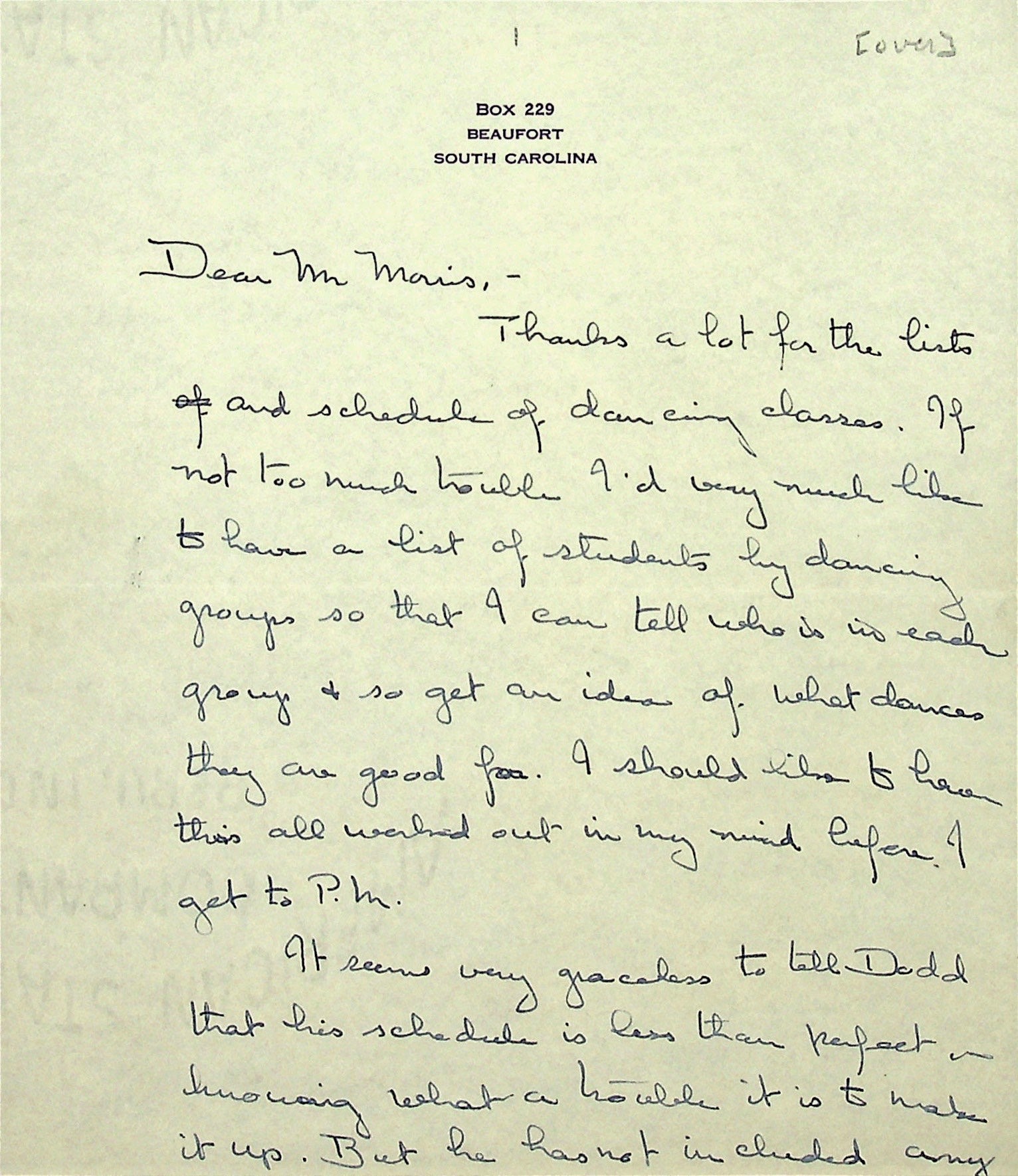 June 4, 1937. To Morris from Christensen. Received check for $50 from PMSS for dance instruction. Cannot teach at PMSS summer school, “for want of a musician.” Asks about Morris’s visit to Sarasota, FL; invites the Morris family to visit her at Edisto Beach; asks whether her mother, Miss [Sally] Putnam and herself can board at PMSS this summer.
