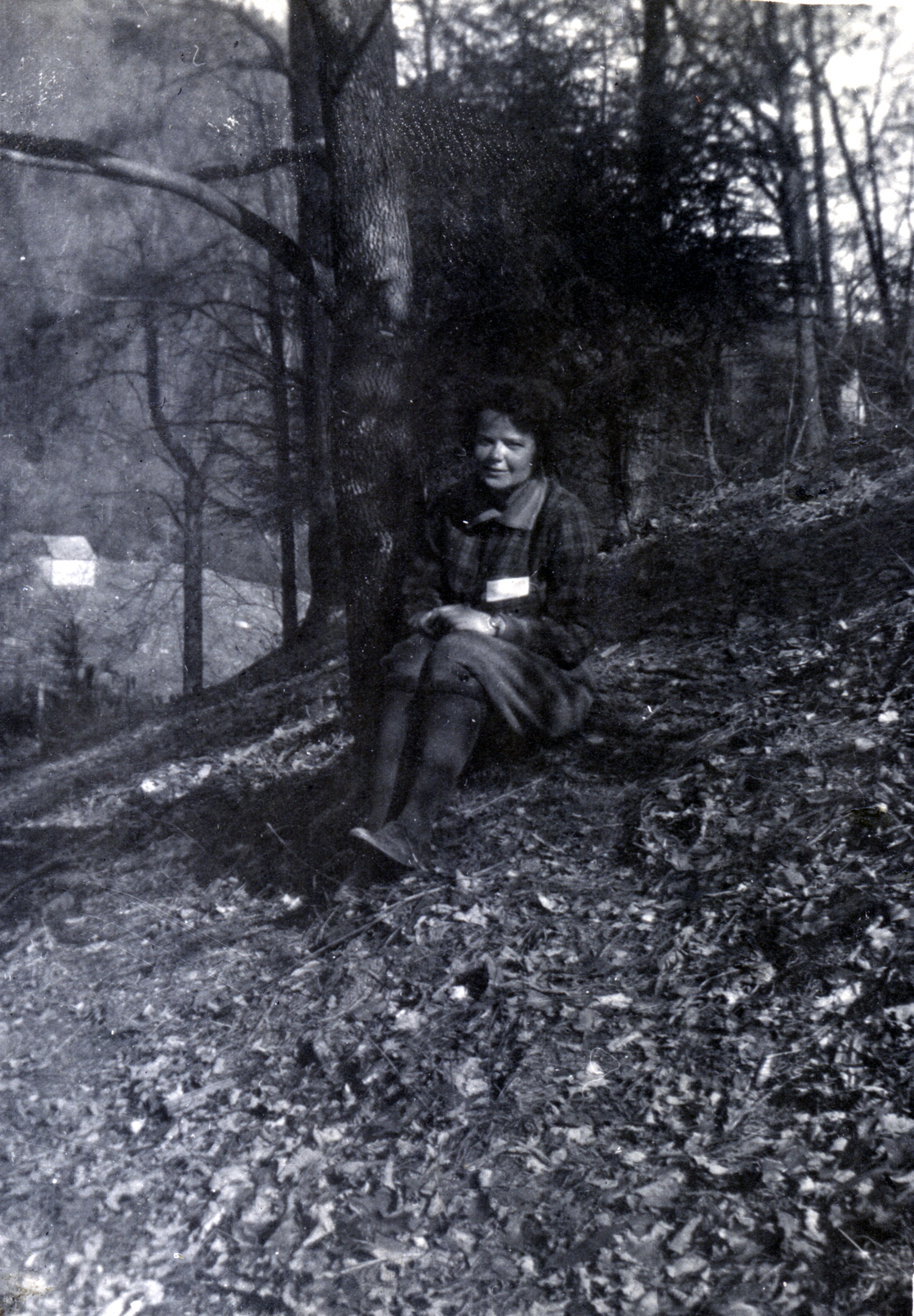 - Medical Settlement, Big Laurel. Aileene Lewis seated on hillside. [nesb_037_mod.jpg]