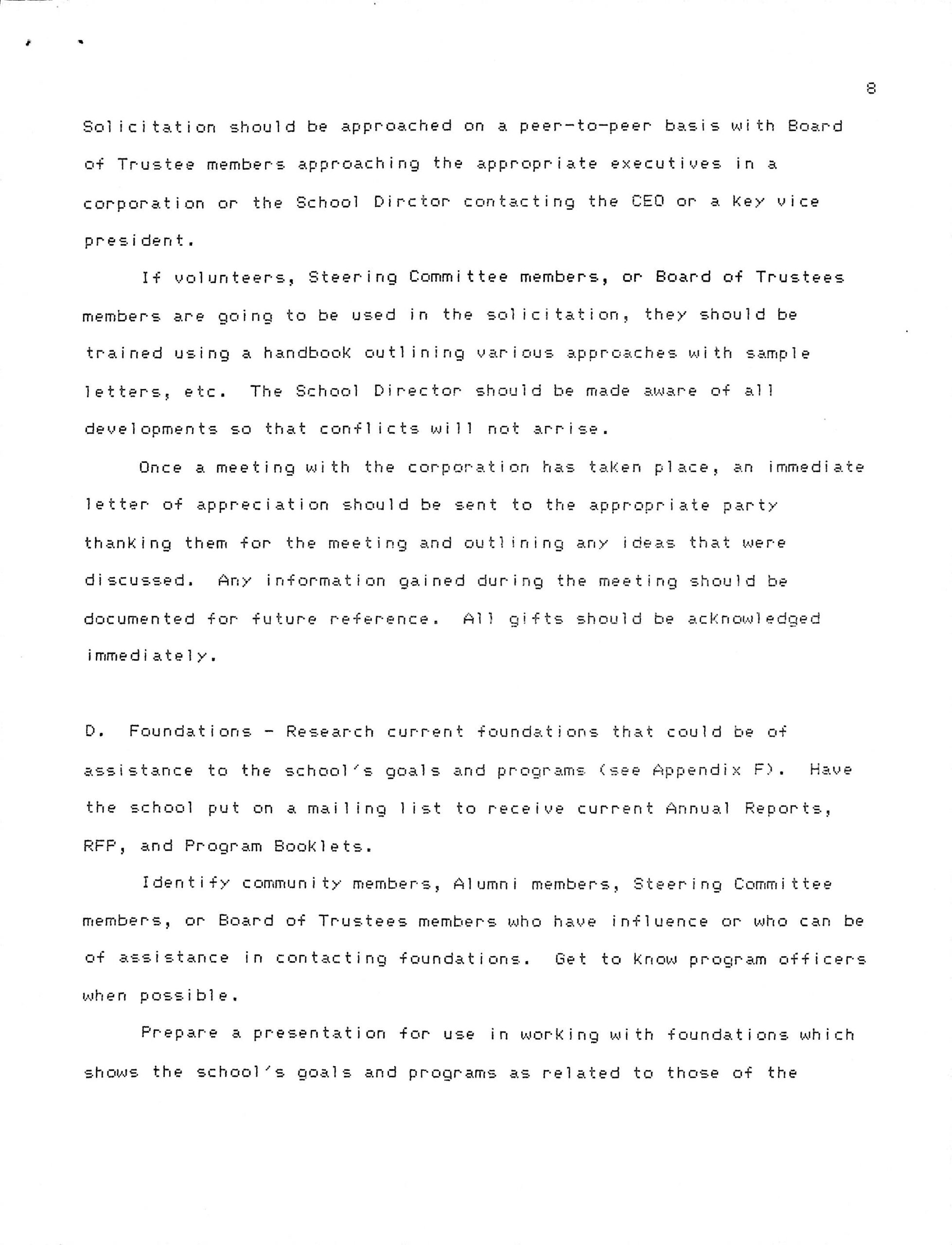 D. Foundations – Research current foundations that could be of assistance to the school’s goals and programs (see Appendix F). Have the school put on a mailing list to receive current Annual Reports, RFP, and Program Booklets.