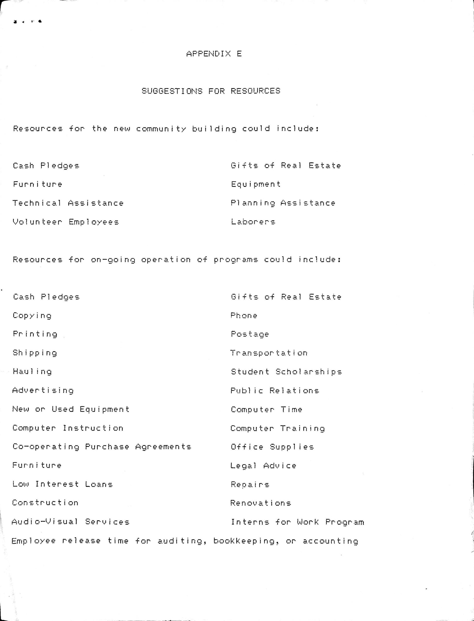 B. Office Budget – The cost of a Development Office with 1-2 staff members would require a budget of $25,000-$125,000 annually, with approximately $50,000 being a realistic amount for the first year. Items to be included: Director: clerical; fringe benefits; consultant fees; supplies; postage; telephone; copying; newsletter costs; travel; catalogs and reference materials; entertainment; promotional materials; office space: office equipment and membership and association fees. Many of these costs would be in-kind donations, such as Director and office space.