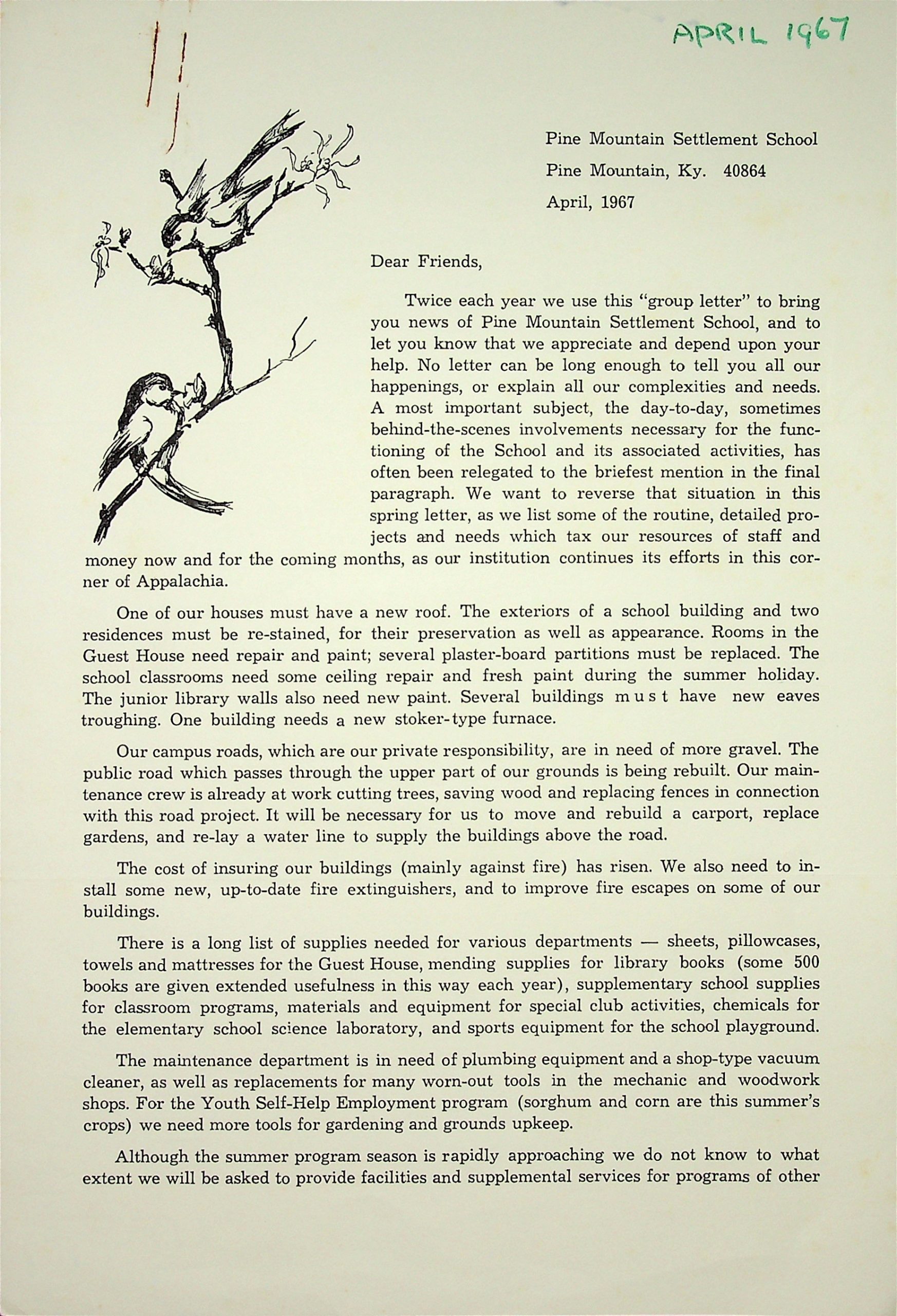 TAGS: Dear Friend letters 1967,fundraising letters,PMSS Director Burton Rogers,sketch by Mary Rogers,photographs of PMSS activities,campus needs,completed projects,unbudgeted needs,PMSS Board of Trustees,Club Day,diverse roles of staff
