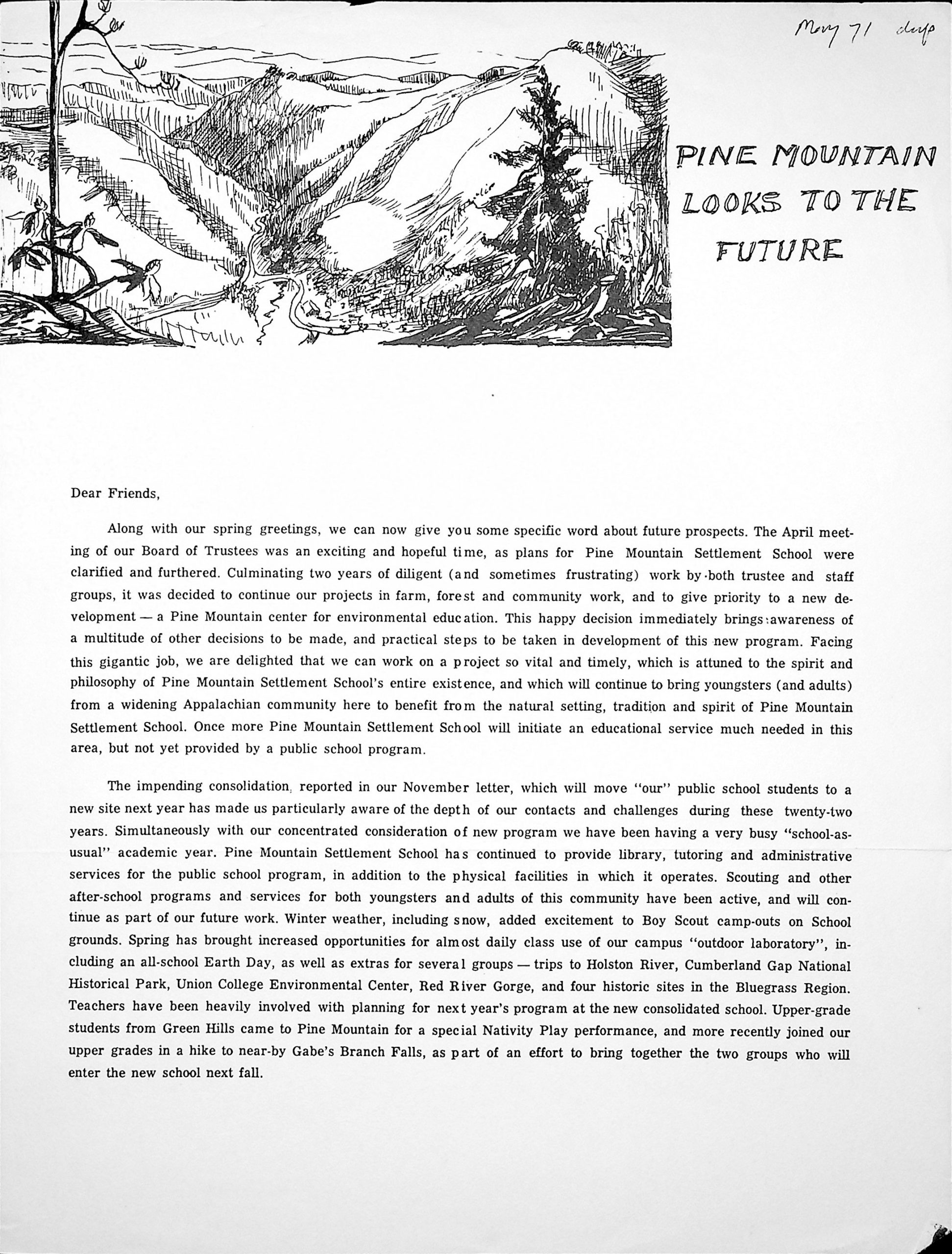 Director Burton Rogers provides a look at the School’s future prospects. After two years of work by trustee and staff groups, The April Board of Trustees’ meeting clarified and furthered plans to “continue our projects in farm, forest and community work and to give priority to…a Pine Mountain center for environmental education.” Many decisions must still be made. “…we are delighted that we can work on a project so vital and timely, which is attuned to the spirit and philosophy of Pine Mountain Settlement School’s entire existence and which will continue to bring youngsters (and adults) from a widening Appalachian community here….”