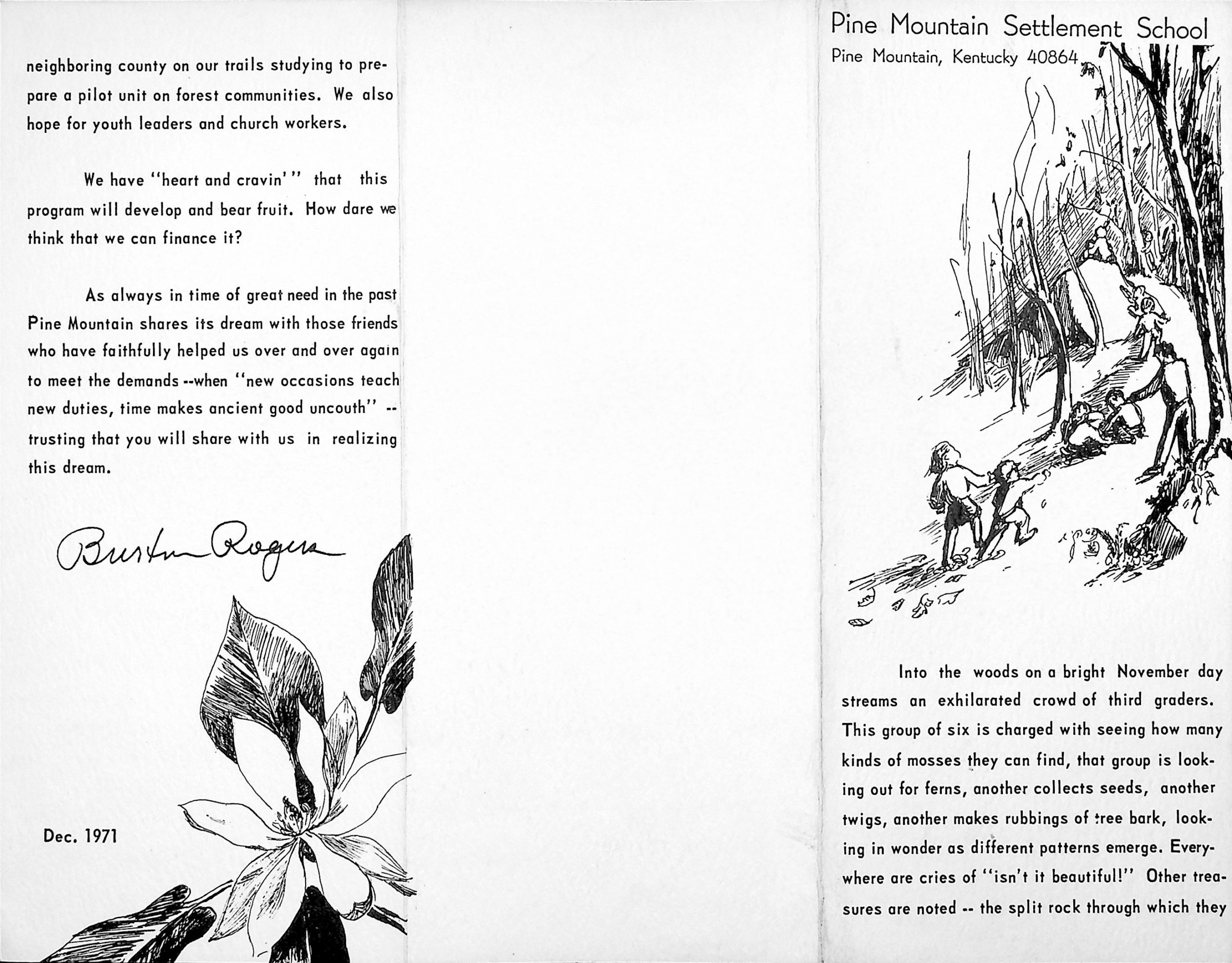 [Continued from the Cover] Rogers quotes the children’s positive reactions to the woods. He asks, “Is there some way to preserve and develop in children the sense of being in tune with the created world?” He answers that Pine Mountain has been providing opportunities for children to “grow into adults who love and cherish the community of living things and do not seek to exploit and destroy it.”