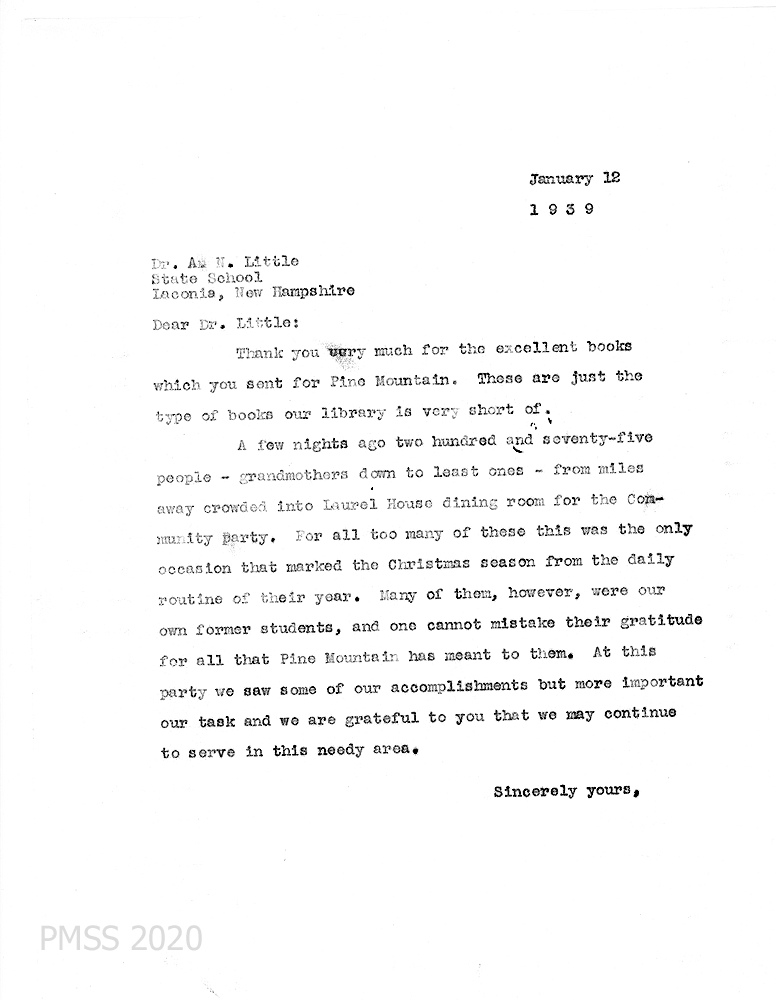 003 and 016 [DUPLICATES] January 12, 1939. To Dr. Little from [unsigned, apparently Glyn Morris]. The letter thanks Little for the books that she sent to PMSS. The Community party was held for 250 neighbors, including former students, in the Laurel House dining room to celebrate the Christmas season.