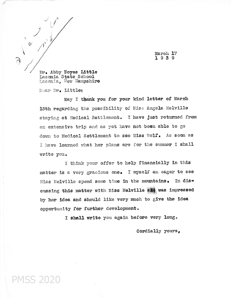 019 June 22, 1939. To Dr. Little from [unsigned, apparently Glyn Morris]. “It has been arranged by Miss Angela Melville to come to Medical Settlement for the month of July.” Asks about Little’s offer to help financially.