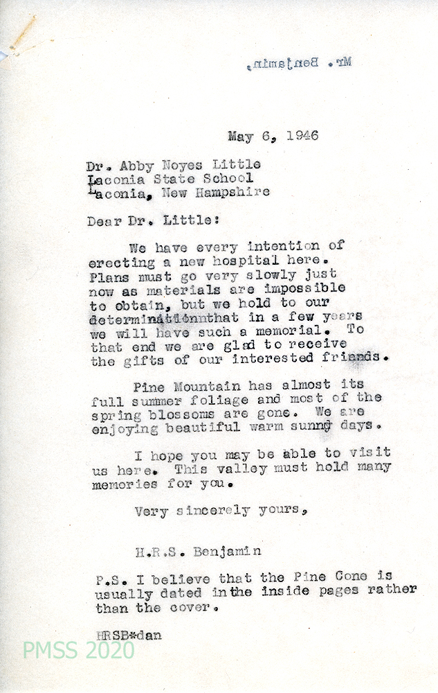 024 April 27, 1946. To Mr. Benjamin from Dr. Little, who asks if a hospital would be made a memorial building for Uncle William and Aunt Sal, as she read in a Pine Cone. If so, she would “like to add my bit.”