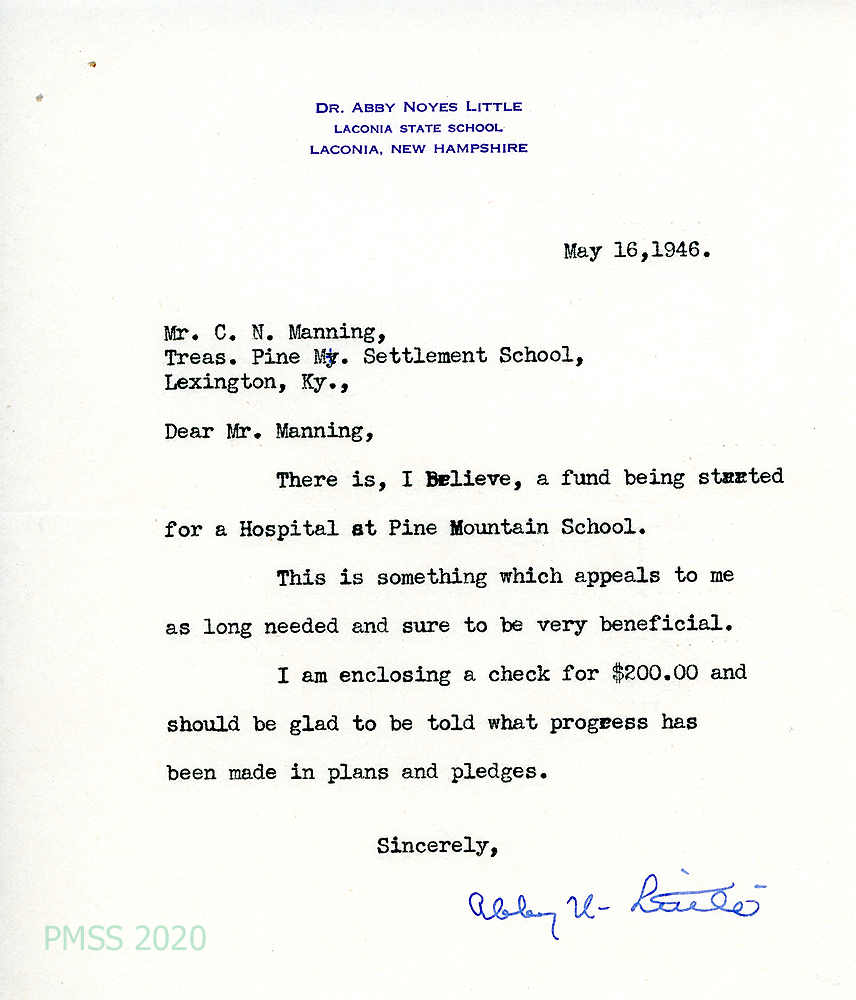 026 May 16, 1946. To Mr. C.N. Manning, PMSS Treasurer, Lexington, KY, from Dr. Little, sending $200 for the PMSS Hospital fund. Signed “Abby N. Little.”