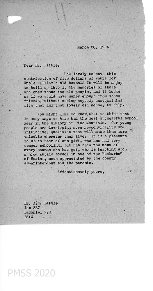 004 March 30, 1926. To Dr. Little from “EZ” (Ethel Zande), who thanks Little for a $5 contribution for “Uncle William’s old house.” …We think we have had the most successful school year in the history of Pine Mountain. Our young people are developing more responsibility and initiative, qualities that will make them more valuable wherever they live. ….”