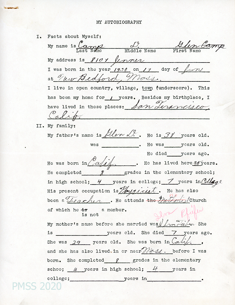 Born in New Bedford, MA, on June 17, 1930. Last attended school at LaJolla, California. Ready to enter eighth grade.