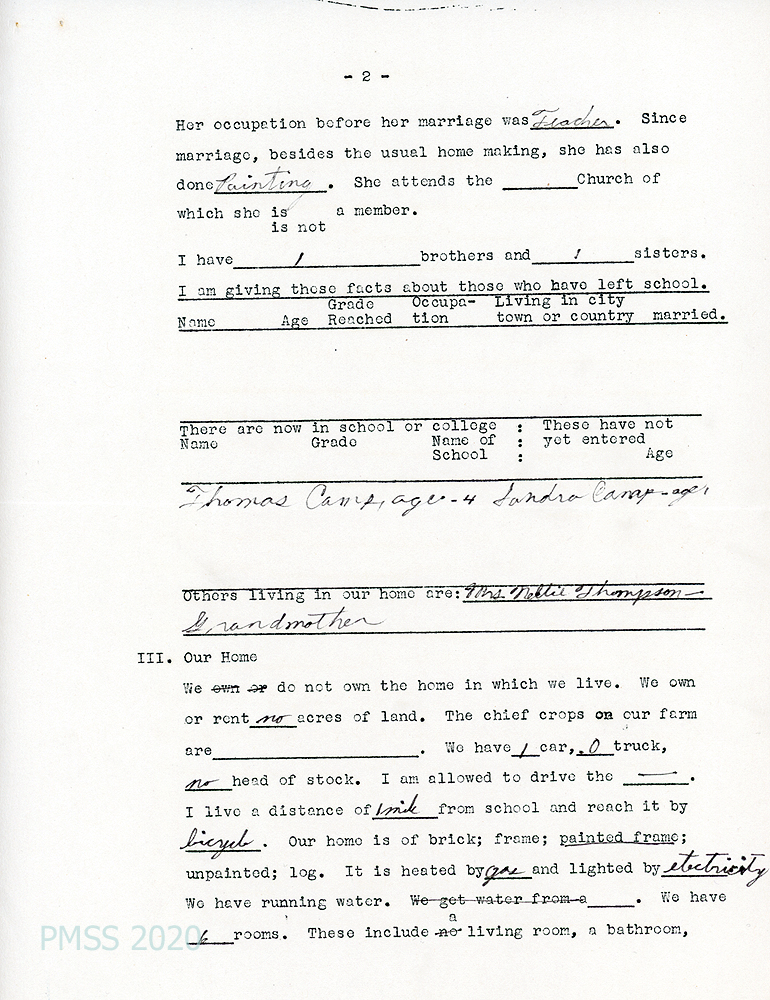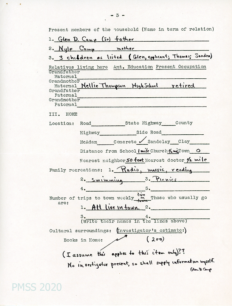 [003b, p. 3] Grandmother: Nellie Thompson. Family recreations: Radio, music, reading, swimming, picnics. 200 books in home.