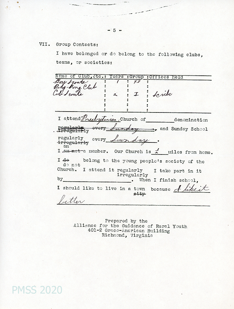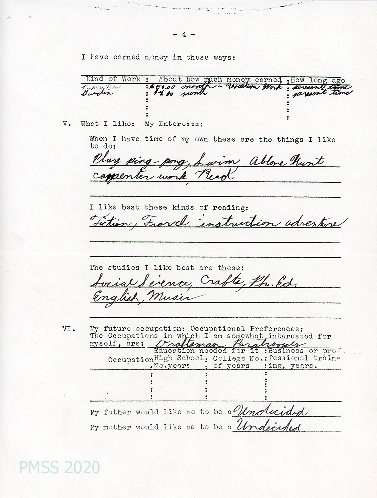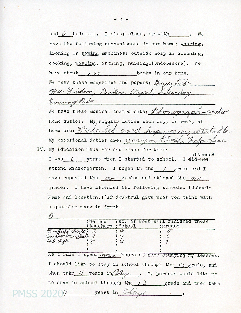 [002b, p. 3] Reads Boy’s Life, Wee Wisdom, Reader’s Digest, Saturday Evening Post. Would like to attend college.