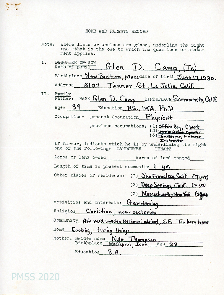 [003] through [003f] HOME AND PARENTS RECORD. [003, p. 1] Father, age 39, born in Sacramento, CA; education BS, MA, Ph.D.; physicist; has lived in present community 1 year; previously lived in San Francisco, CA, for 7 years and Deep Springs, CA, for 2 years. Mother; Nyle Thompson, age 33, born in Mediapolis, Iowa; education BA.