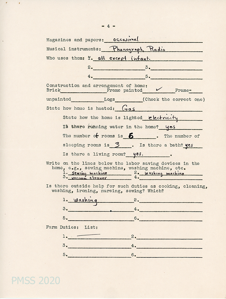 [003c, p. 4] Parent describes the home they live in, which has a sewing machine, washing machine and vacuum cleaner. Washing is done by outside help.