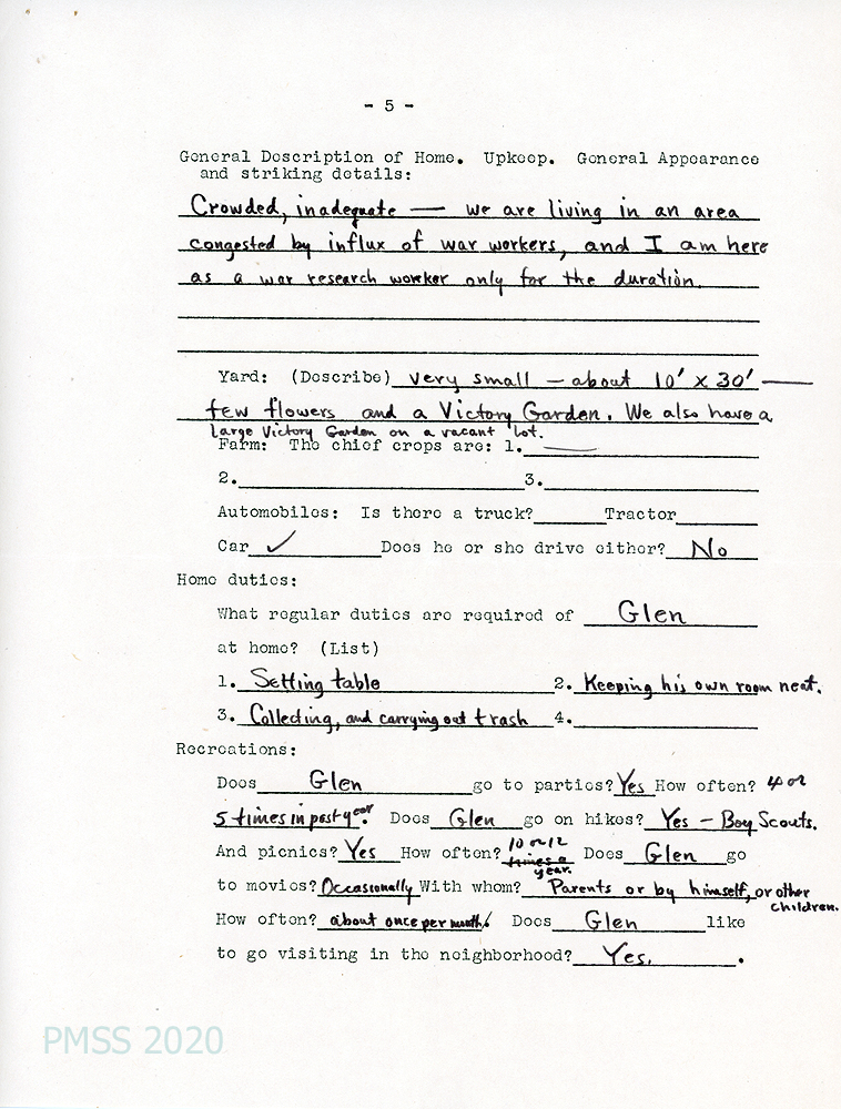 [003d, p. 5] General description of home: “Crowded, inadequate — we are living in an area congested by influx of war workers, and I am here as a war research worker only for the duration.” Yard: “very small…a Victory Garden. We also have a large Victory Garden on a vacant lot.”