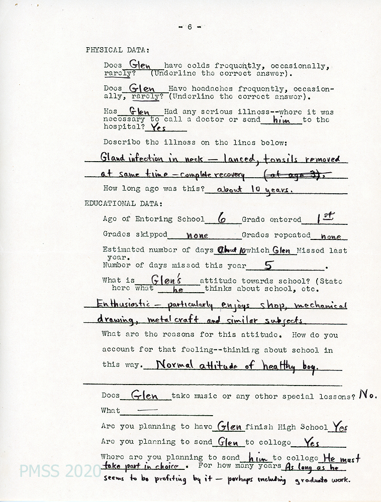[003e, p. 6] PHYSICAL DATA, EDUCATIONAL DATA. Glen’s attitude towards school: “Enthusiastic — particularly enjoys shop, mechanical drawing, metal craft and similar subjects.” Are you planning to send him to college? “He must take part in choice.” For how long? “As long as he seems to be profiting by it — perhaps including graduate work.”