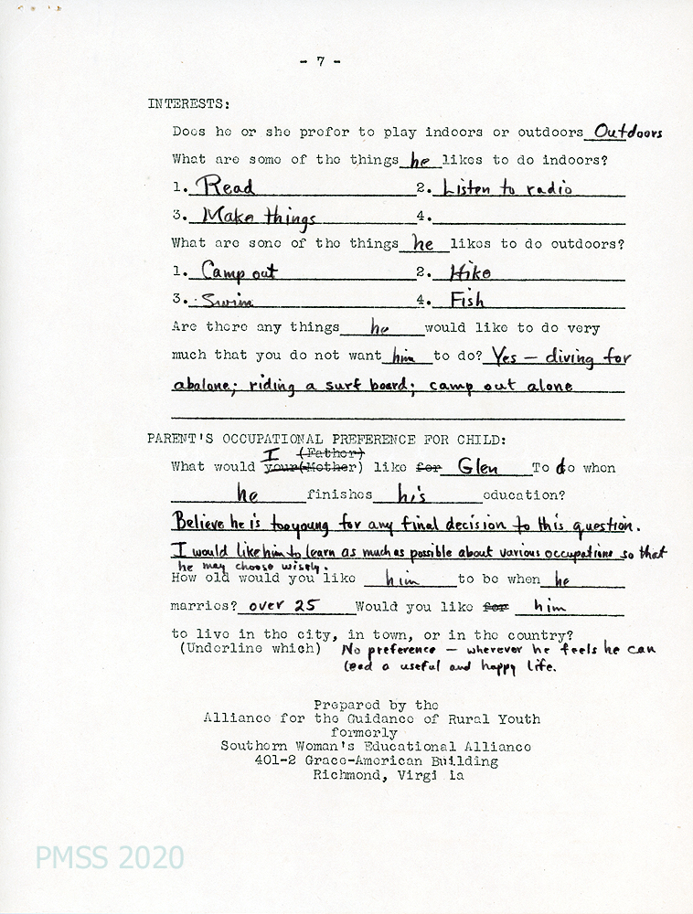 [003f, p. 7] INTERESTS. “Read, listen to radio, make things … camp out, swim, hike, fish.” Are there any things he would like to do very much that you do not want him to do? “Yes — diving for abalone, riding a surf board, camp out alone.