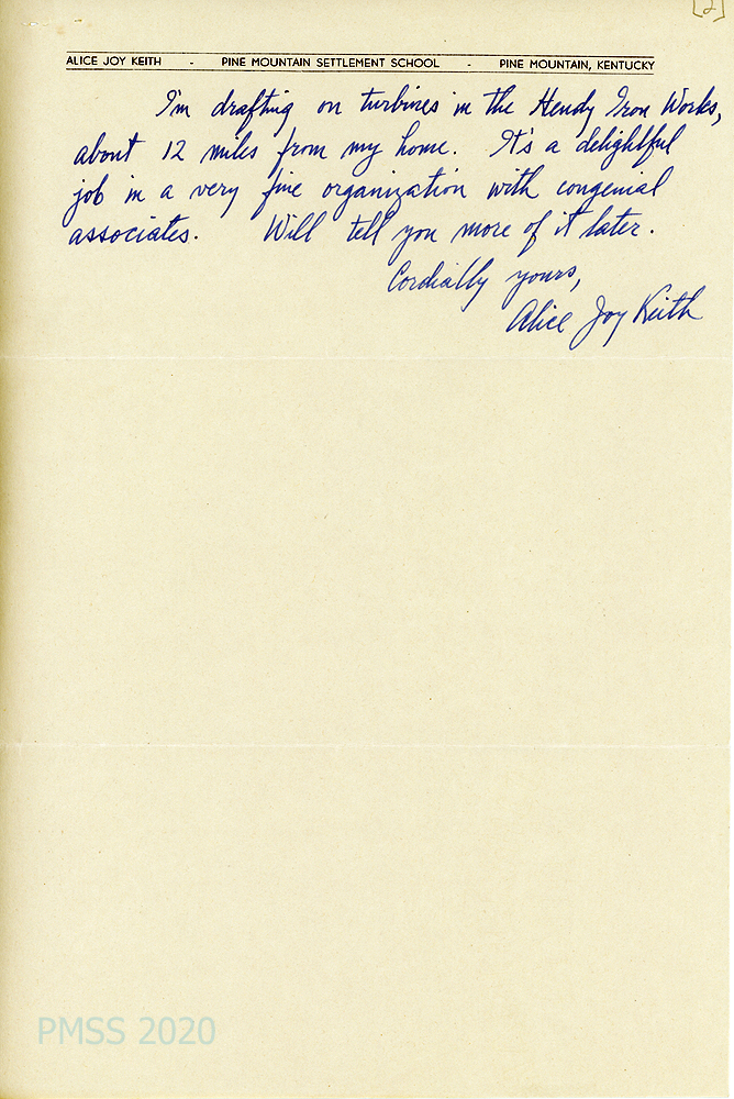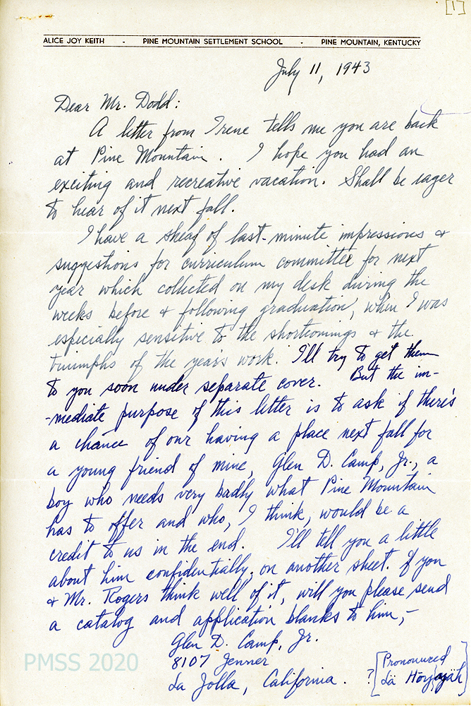 [004] through [004c]. July 11, 1943. To Mr. [Arthur W.] Dodd from Alice Joy Keith, [004, p. 1] who will be sending a “sheaf of last-minute impressions & suggestions for curriculum committee for next year [written] during the weeks before & following graduation….” Asks Dodd and Mr. [Burton] Rogers consider a place next fall for “a young friend of mine, Glen D. Camp, Jr., a boy who needs very badly what Pine Mountain has to offer and who, I think, would be a credit to us in the end.” Provides Glen’s address in La Jolla, CA. [004a] “I’m drafting on turbines in the Hendy Iron Works…. It’s a delightful job in a very fine organization with congenial associates.”