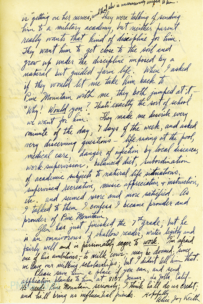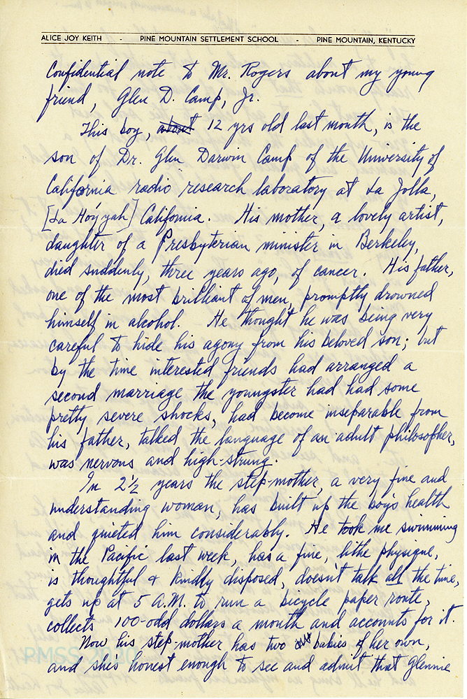 [004b, p. 2] “Confidential note to Mr. Rogers about my young friend, Glen D. Camp, Jr.” Alice Joy Keith tells the story about young Glen’s life. His father, Dr. Glen Darwin Camp is an employee of the University of California radio research laboratory at La Jolla, CA. “His mother, a lovely artist, daughter of a Presbyterian minister in Berkeley, died suddenly, three years ago, of cancer.” This shock had adversely affected both father and son but both were very close. The father married a second time to “a very fine and understanding woman [who] has built up the boy’s health and quieted him considerably.” The stepmother eventually had two children of her own and saw that [004c, p. 3] she could no longer adequately attend to “Glennie.” When Alice Joy Keith offered to take him to PMSS, they were very interested. She describes him further and asked that a place at PMSS be saved for him. “He needs Pine Mountain seriously.”