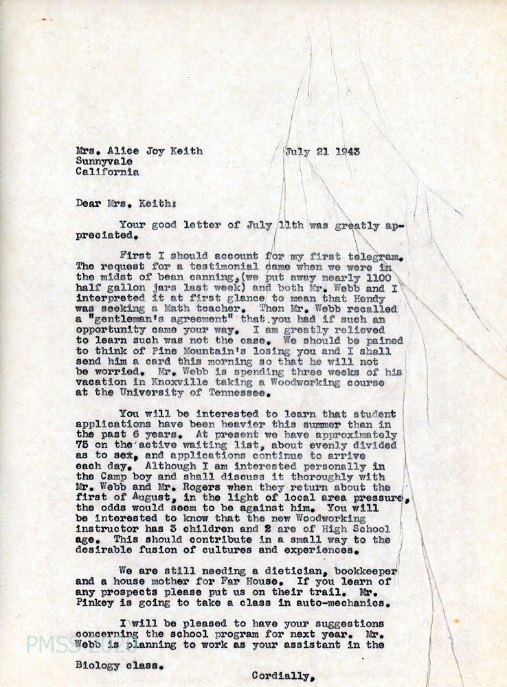 [005] July 21, 1943. To Mrs. Alice Joy Keith in Sunnyvale, CA, from [unsigned, apparently, Dodd], who thanks her for her letter of July 11. Mentions his telegram, bean canning, Hendy, and Mr. Webb, who is taking a woodworking course at the University of Tennessee. Has a heavier load of student applications than in the past 6 years: 75 on the active waiting list. The Camp boy’s odds may be against him, “in the light of local area pressure…the new Woodworking instructor has 3 children and 2 are of high school age. This should contribute in a small way to the desirable fusion of cultures and experiences.”