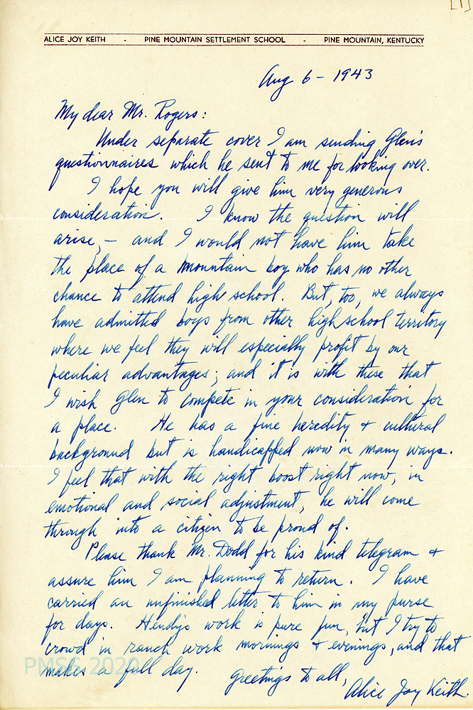 [006] August 6, 1943. To Mr. Rogers from Alice Joy Keith. Encloses Glen’s questionnaires which Glen asked her to review. “…I would not have him take the place of a mountain boy …but, too, we always have admitted boys from other high school territory where we feel they will especially profit by our peculiar advantages; and it is with these that I wish Glen to compete in your consideration for a place. He has a fine heredity & cultural background but is handicapped now in many ways. I feel that with the right boost right now, in emotional and social adjustment, he will come through into a citizen to be proud of.”