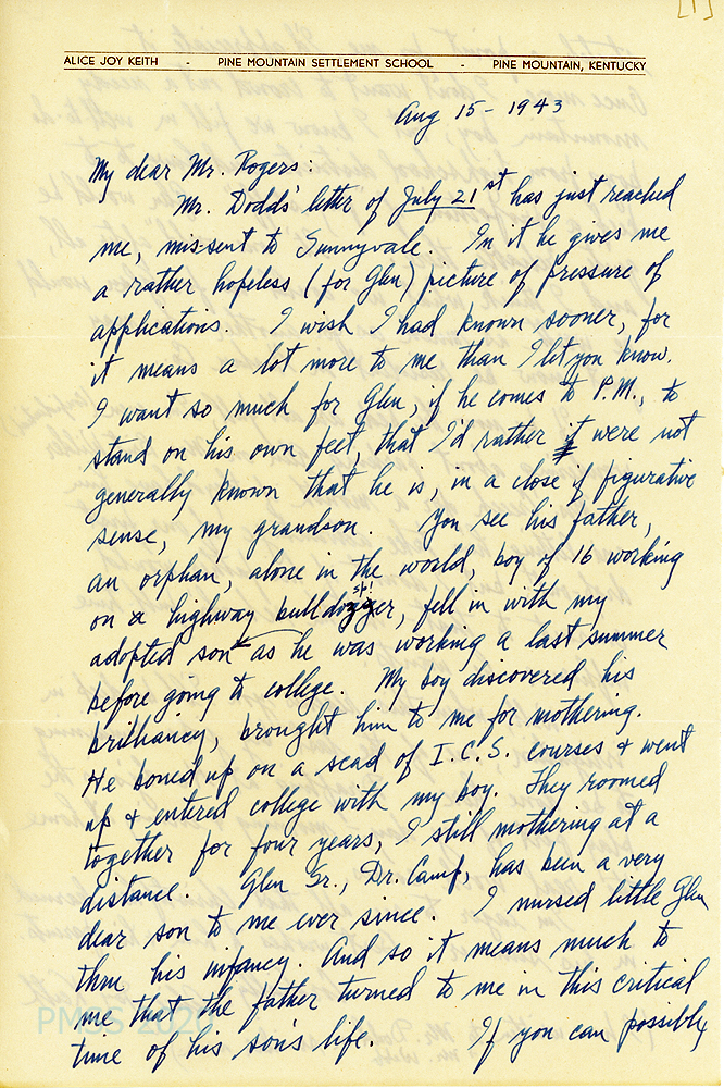 [007], [007a] August 15, 1943. Two-page letter to Mr. Rogers from Keith. [007, p.1] She writes how much it means to her that Glen would be accepted by PMSS, stating that Glen “is, in a figurative sense, my grandson.” Glen Sr., an orphan working on a highway bulldozer at age 16, was befriended by Alice’s adopted son who then had brought the friend to Alice for “mothering.” The boys attended college together and Alice was “still mothering at a distance. Glen Sr., Dr. Camp, has been a very dear son to me ever since. I nursed little Glen through his infancy. And so it means much to me that the father turned to me in this critical time of his son’s life….”