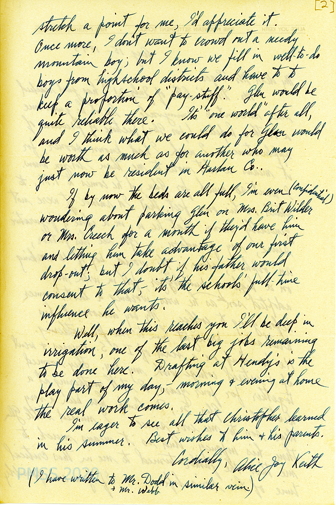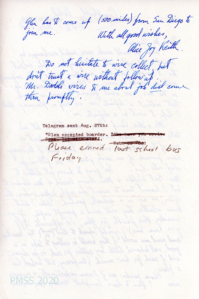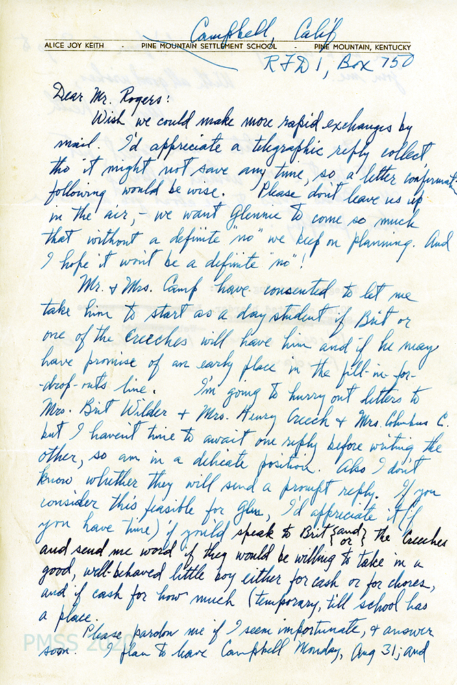 [013], [013a] N.D. Two-page letter to Mr. Rogers from Alice Joy Keith in Campbell, CA, [013, p.1] who anxiously awaits the School’s decision on accepting “Glennie.” She asks Rogers to ask Mrs. Brit Wilder, Mrs. Henry Creech, and Mrs. Columbus C[reech] if they will let Glen stay with them for cash or work until a place opens at the School due to drop-outs. [013a, p.2] She will be leaving Campbell, CA, on August 31 after Glen arrives from San Diego, 500 miles away. Typewritten note at end of letter: “Telegram sent August 27th: ‘Glen accepted boarder’” with handwritten note: “Please connect [?] last school bus Friday.”