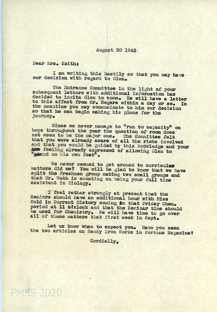 [008] August 20, 1943. To Mrs. Keith from [unsigned, possibly Dodd]. The Entrance Committee, having received her subsequent letters with additional information, has “decided to invite Glen to come.” Mr. Rogers will write to Glen Jr. about this decision. “The Committee felt that you were already aware of all the risks involved.…” He then writes about “curriculum matters,” mentioning Mr. Webb and Miss [Edith] Cold. Mentions two articles in Fortune magazine about Hendy Iron Works.