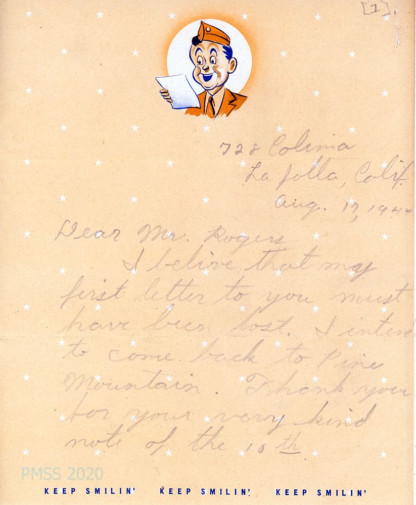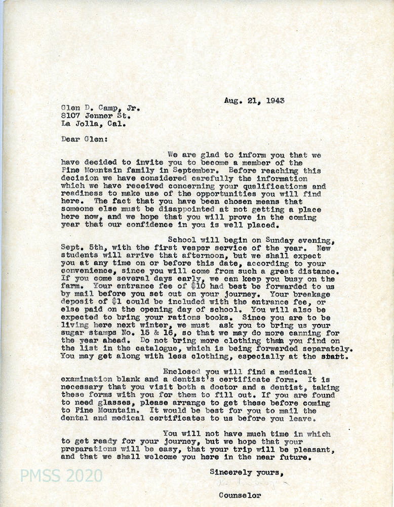 [010] August 21, 1943. To Glen D. Camp Jr., La Jolla, CA, from [unsigned – Dodd?], Counselor, inviting him to “become a member of the Pine Mountain family in September.” Provides the School’s opening and Vesper service dates; asks him to send entrance fee and breakage deposit and to bring rations books and sugar stamps. Advises about clothing; encloses a medical examination blank and a dentist’s certificate form.