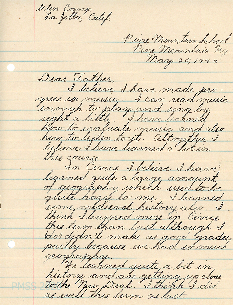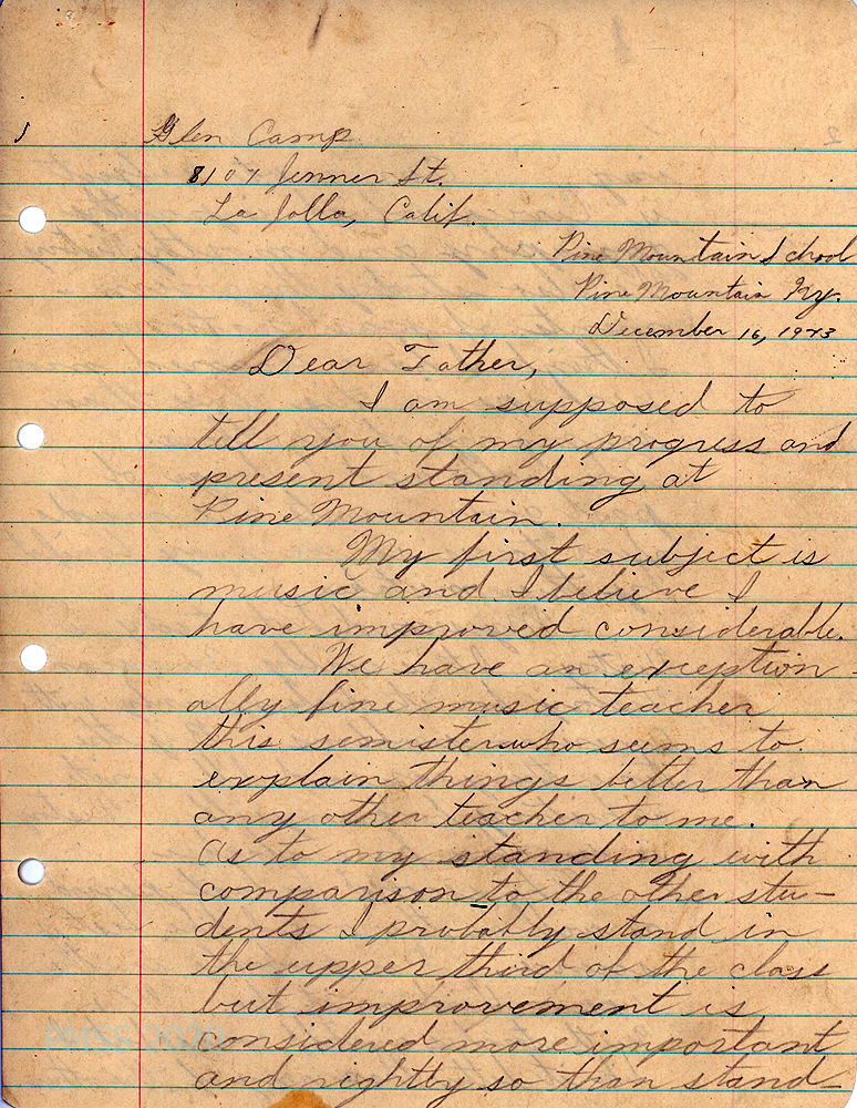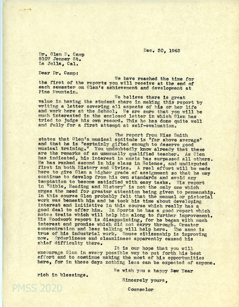[011] December 30, 1943. To Dr. Glen D. Camp, La Jolla, CA, from [unsigned], Counselor, sending the first of the end-of-semester reports “on Glen’s achievement and development at Pine Mountain.” Also encloses a letter from Glen Jr., which is a self-evaluation. Miss Smith reports that his musical aptitude is “far above average” and should have musical training; he is second in his Science class; and first in History and Civics. He demonstrated less interest in Bible reading and history, woodworking and industrial work. “House citizenship” is improving, which includes orderliness and cleanliness.