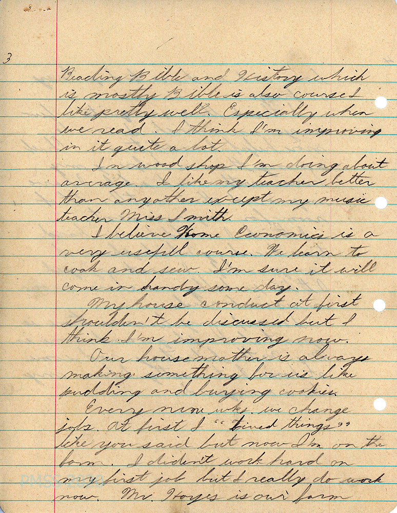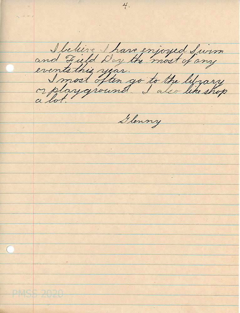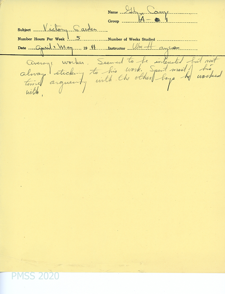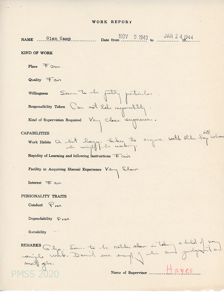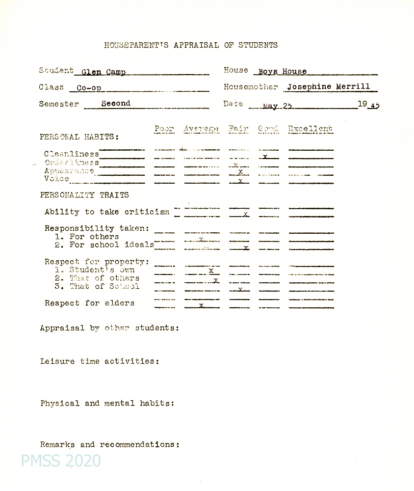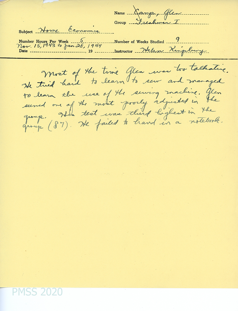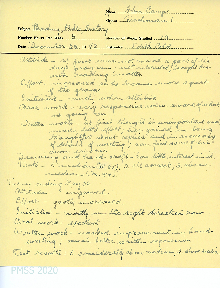 Glen was highest in class in Civics; tied with two others for first place in Science; had problems with Home Economics. The counselor also reported on Glen’s improved progress in Music, Reading Bible and History and Woodwork. He showed excellent sportsmanship in Sports; at the head of the History class; and average in Agriculture where he was “seemingly interested but not always sticking to his work and spending too much time arguing with the boys he worked with.” His performance in Industrial work and dishwashing was fair; generally good in house citizenship.
