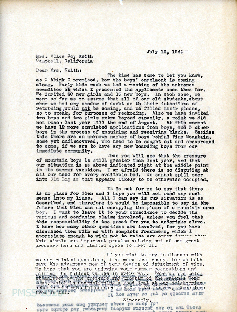 [017] July 15, 1944. To Mrs. Alice Joy Keith from [unsigned, apparently, Mr. Rogers], who explains how the School decides to accept a number of extra students beyond capacity, causing “[t]he pressure of mountain boys is still greater than last year….[I]t would be impossible to say in the future that Glen was not occupying the pace of a mountain area boy. I want to leave it to your conscience to decide the various and confusing claims involved….” Ends by mentioning the presence of the Friends Work Camp.