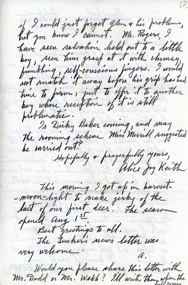 [018] August 5, 1944. Two-page letter to Mr. Rogers from Alice Joy Keith, Campbell, CA., [018, p.1] who writes “I wish you & I might see eye to eye in the matter of admissions, but guess it’s not to be. I hope a place may be saved for Glen Camp this fall. His determination to return to Pine Mountain does not waver….The family situation in the south remains much as before & I feel my responsibility not lessened.” [018a, p.2] “Mr. Rogers, I have seen salvation held out to a little boy, seen him grasp at it with clumsy, fumbling, self-conscious fingers. I would not snatch it away before his grip has had time to firm, just to offer it to another boy whose reception of it is still problematic.” Mentions Dicky Baker, Miss Merrill, the Tuckers’ newsletter; asks that this letter be shared with Mr. Dodd or Mr. Webb.