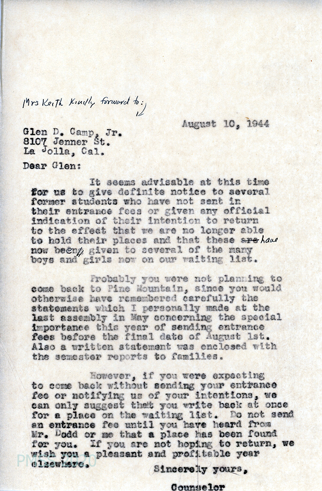 [019] August 10, 1944. To Glen D. Camp Jr., La Jolla, CA, from [unsigned], Counselor, who tells him that, since he hasn’t sent in his entrance fees or shown intention to return, his place was given to another on the waiting list. If he is returning, he will be placed on a waiting list.