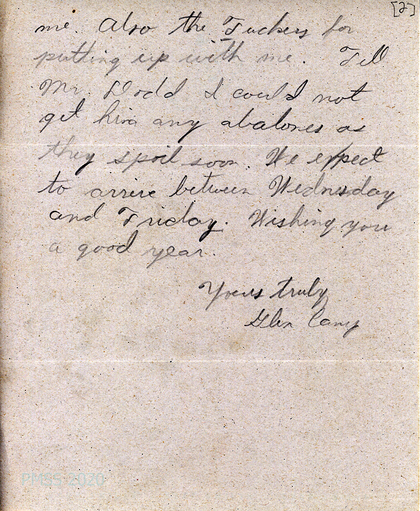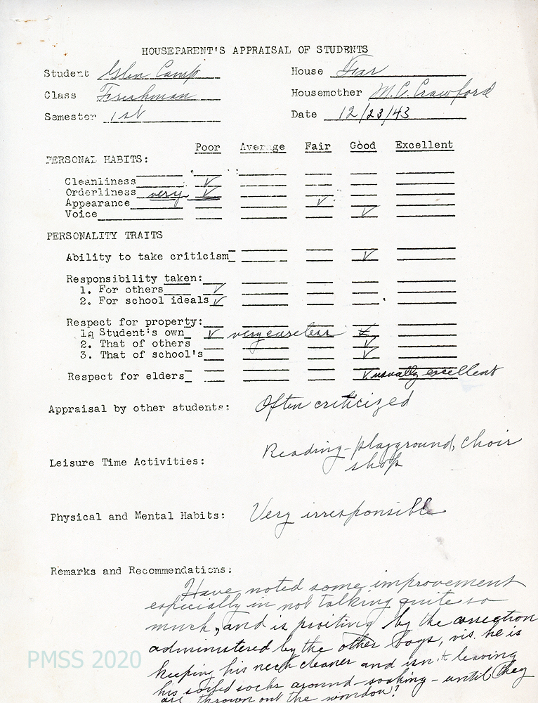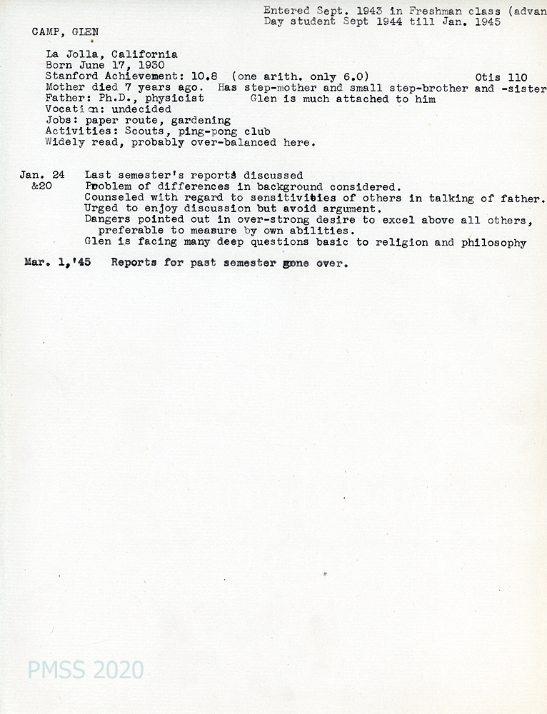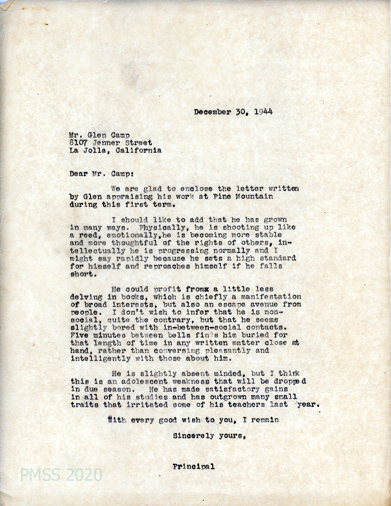 [022] December 30, 1944. To Mr. Glen Camp Sr, La Jolla, CA, from [unsigned], Principal, who is enclosing Camp’s son’s letter of self-evaluation for the first term. “…[H]e has grown in many ways. Physically, he is shooting up like a reed, emotionally, he is becoming more stable and more thoughtful of the rights of others, intellectually he is progressing normally and I might say rapidly because he sets a high standard for himself and reproaches himself if he falls short.”