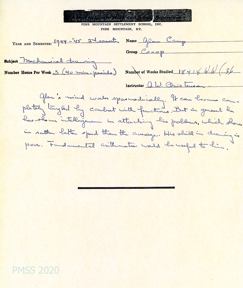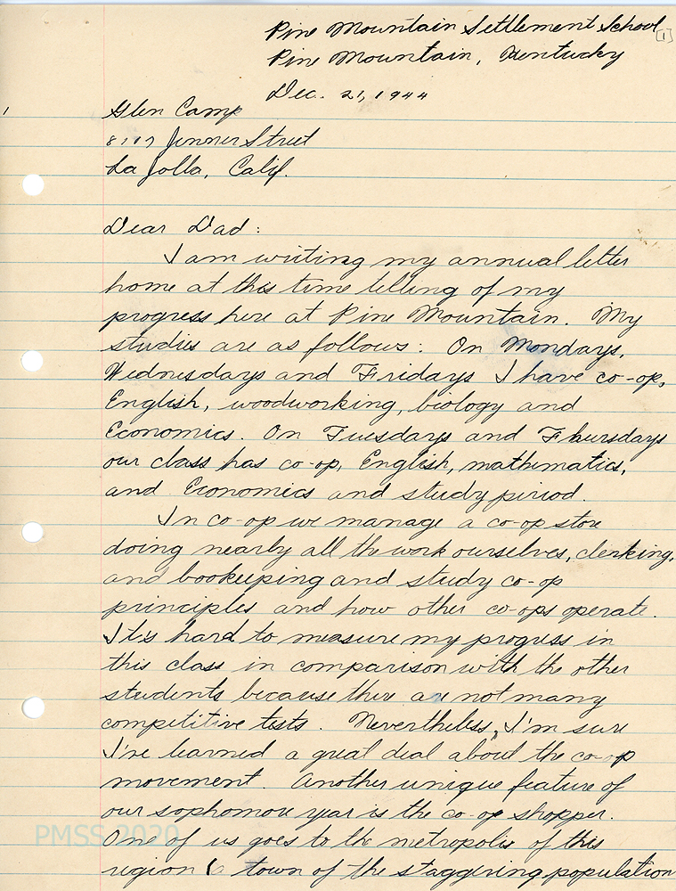 [023] through [023c] December 21, 1944. Four-page letter to “Dad” from Glen Camp Jr, who is sending an annual self-evaluation of his progress at Pine Mountain. [023, p.1] He lists his classes as Co-op, English, Woodworking, Biology, Economics and Mathematics. He describes his Co-op class, in which he becomes a co-op shopper who “goes to the metropolis of this region (a town of the staggering population [023a, p.2] of nearly 7,000 to purchase supplies for the campers.” He tells about his experiences in his other classes. [023b, p.3] Describes his work periods: The first 9 weeks he was with the grounds crew and during the next one, he butchered a hog. “There’s more to the farm than meets the eye.” [023c, p.4] The parts of campus life he particularly likes are shopping in Harlan, the Nativity Play and the farm. Mentions the evening program and mechanical drawing.
