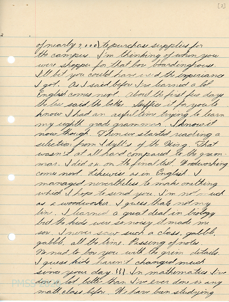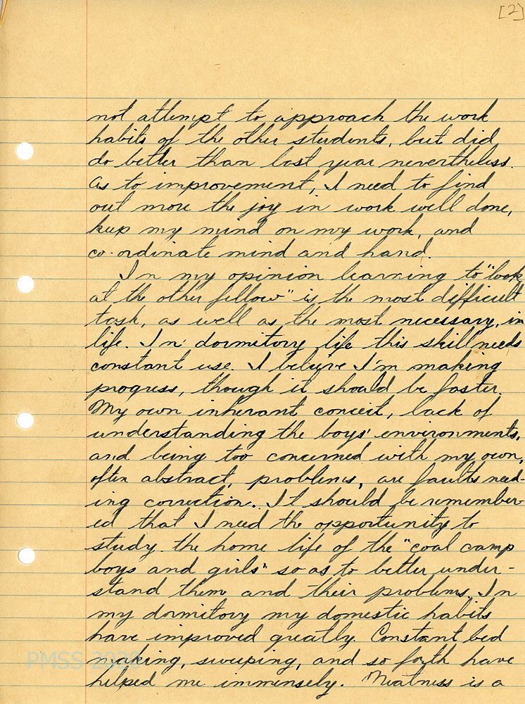 [Note: All letters from PMSS staff are carbon copies, typewritten, unsigned and meant for the Office files. All other letters are handwritten. Some of the work reports and student evaluations by teachers were typed and others were handwritten. The following list of contents is in chronological order and not necessarily in order of the image numbers.]