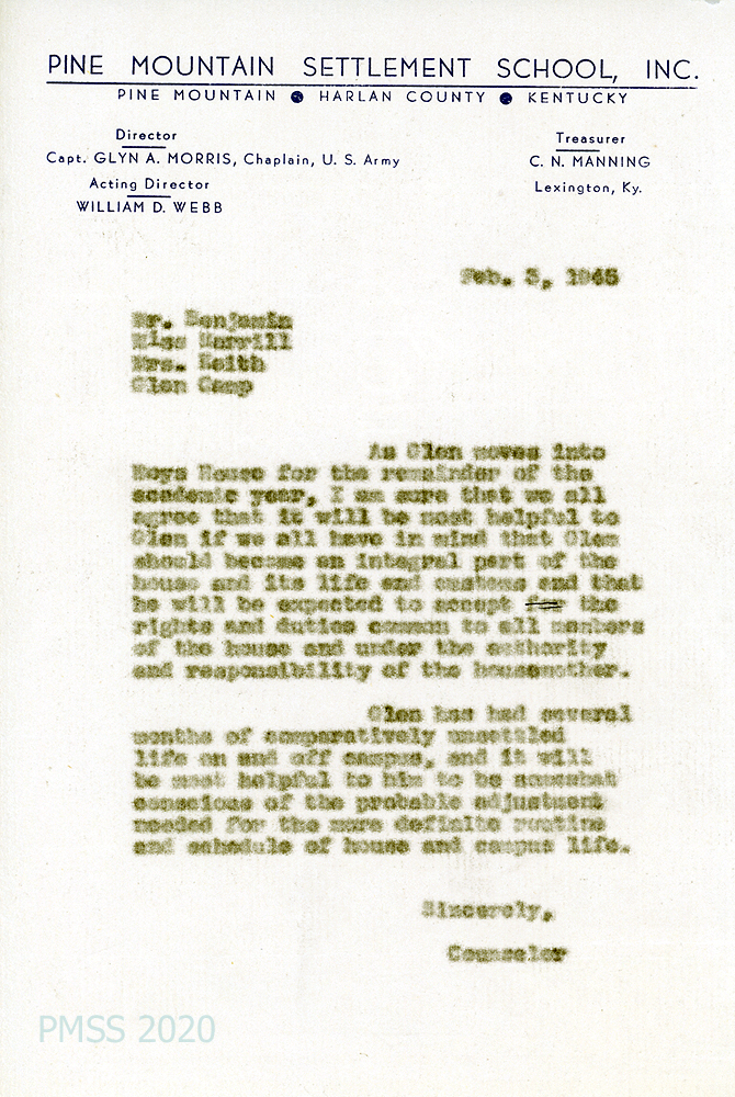 [024] February 3, 1945. Memorandum to Mr. [H.R.S.] Benjamin, Miss Merrill, Mrs. Keith, Glen Camp from [unsigned] Counselor. Because Glen is moving into Boys House for the rest of the academic year, he writes that Glen “should become an integral part of the house and its life and customs and that he will be expected to accept the rights and duties common to all members of the house and under the authority and responsibility of the housemother.” He will need to “be somewhat conscious of the probable adjustment needed for the more definite routine and schedule of house and campus life.”
