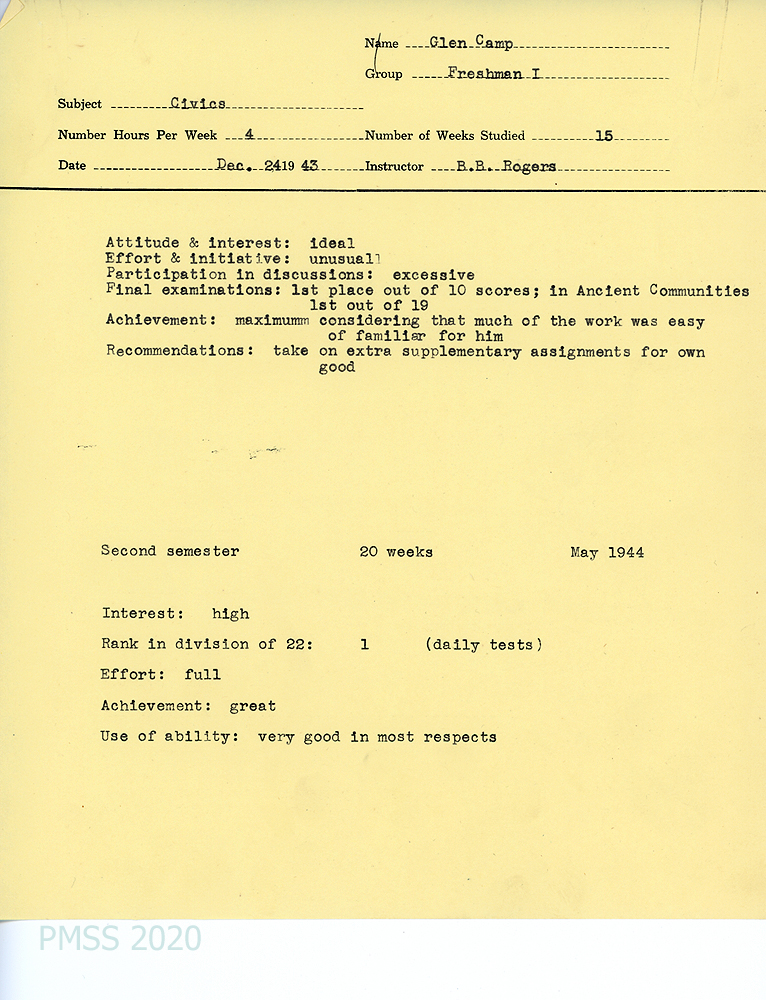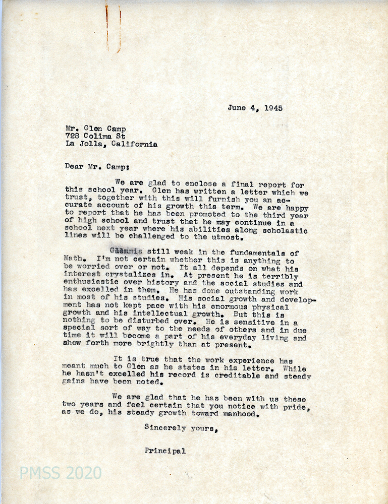 [025] June 4, 1945. To Mr. Camp, La Jolla, CA, from [unsigned, li], Principal, who encloses a final report for the school year and Glen’s self-evaluation letter. Dodd reports that Glen was promoted to the third year of high school and “trusts that he may continue in a school next year where his abilities along scholastic lines will be challenged to the utmost.” He is weak in math but excelled in history and social studies and “did outstanding work in most of his studies….He is sensitive in a special sort of way to the needs of others and in due time it will become a part of his everyday living and show forth more brightly than at present.”