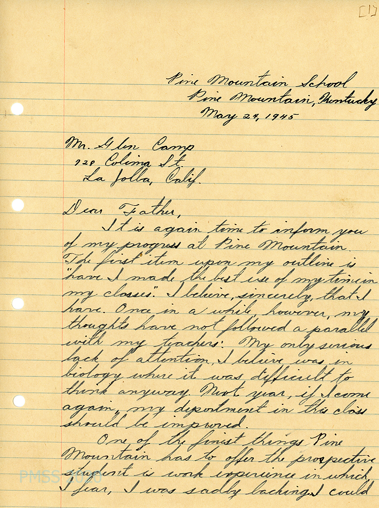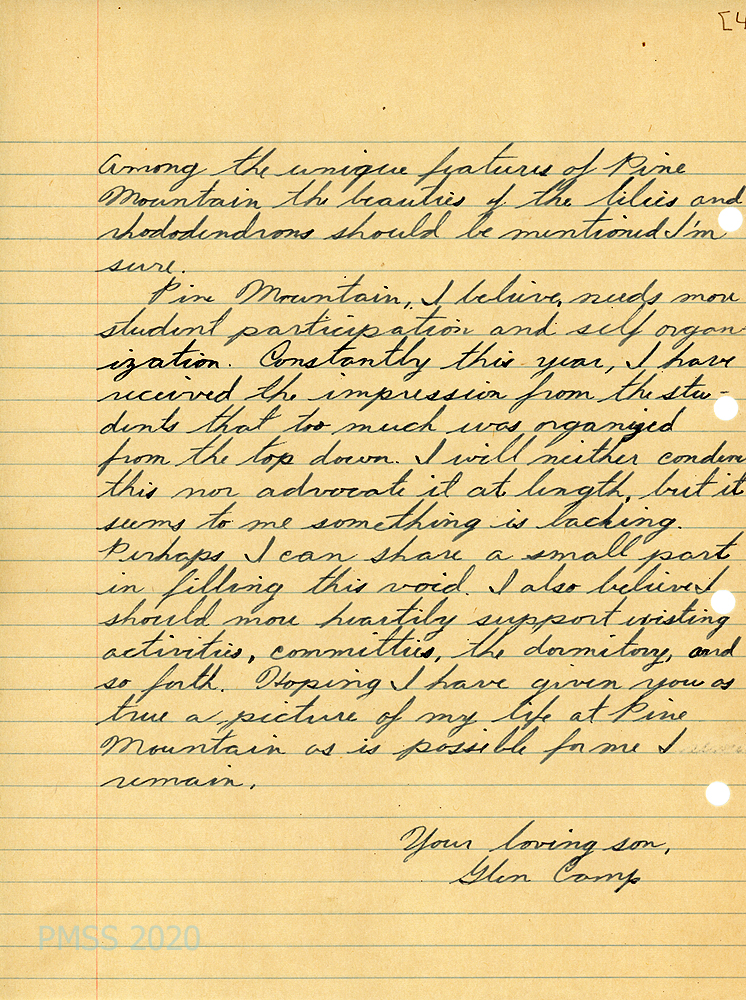 [026] through [026c] May 24, 1945. Four-page letter to “Father” from Glen Camp, who details his progress in his classes. [026, p.1] “One of the finest things Pine Mountain has to offer the prospective student is work experience in which, I fear, I was sadly lacking.” [026a, p.2] “In my opinion, learning to ‘look at the other fellow’ is the most difficult task, as well as the most necessary in life. In dormitory life this skill needs constant use.” He believes he is making progress but needs to “study the home life of the ‘coal camp boys and girls’ so as to better understand them and their problems.” [026b, p.3] He describes the unique features of the School: work experience, co-op courses and store, … the opportunity of understanding Kentucky’s problems, economic, topographical, social and political, and opportunities for leadership.” He helped organize a study club that analyzes international problems and serves as editor [026c, p.4] Also unique are “the beauties of the lilies and rhododendrons.” He feels that Pine Mountain needs “more student participation and self-organization.” Too often “too much was organized from the top down.”