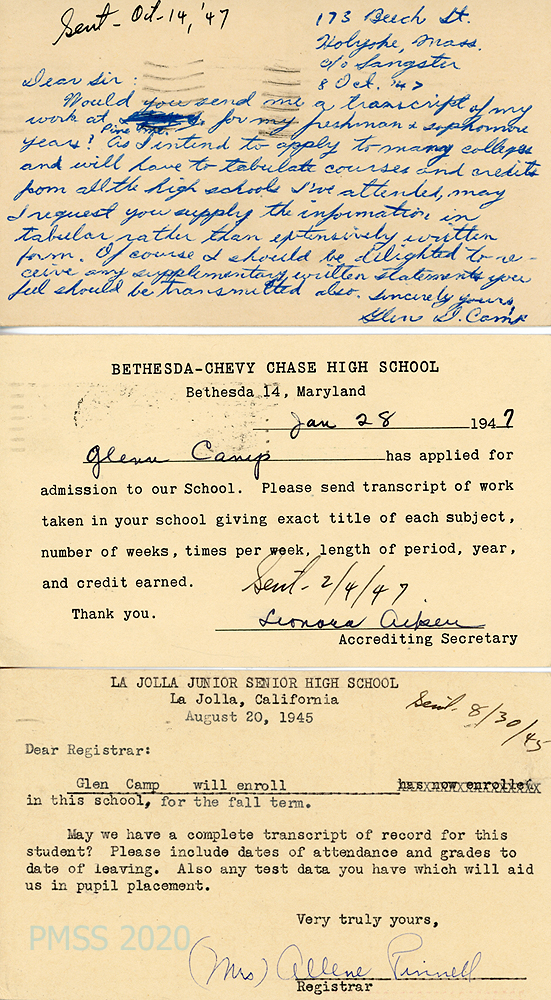 [028] October 8, 1947. [1st image] Postcard to “Sir” from Glen D. Camp Jr in Holyoke, MA., requesting his PMSS transcript for his freshman and sophomore years, in preparation for applying to college. [2nd image] January 28, 1947. Request from Bethesda-Chevy Chase (MD) High School for his transcripts. Both items are marked with “sent” dates. [3rd image – see “CONTENTS: 1945” above.]