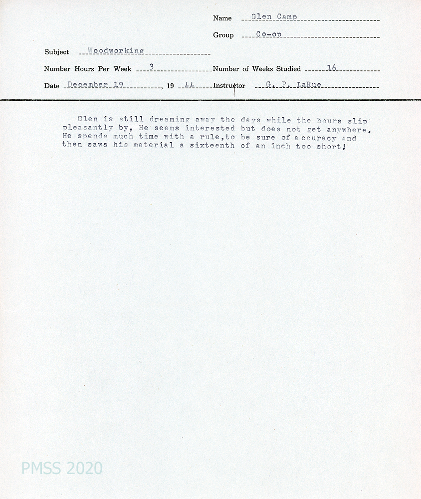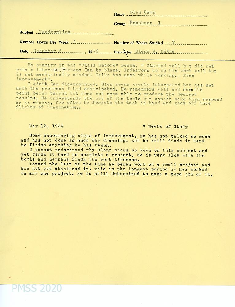 [052] December 8, 1943, and May 12, 1944. Student evaluation by Woodworking teacher, Glen P. LaRue.