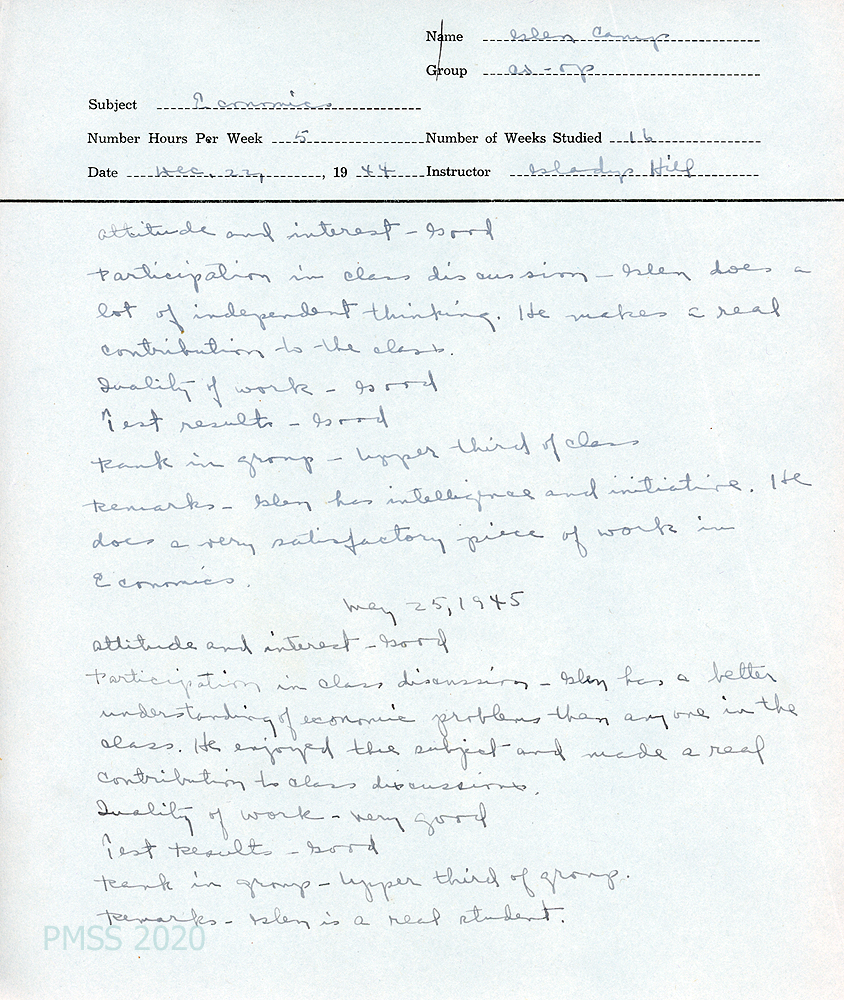[033], [033a] December 22, 1944, and May 24, 1945. Two-page student evaluation by Co-op teacher, Gladys Hill. [033, p.1] “Glen does a lot of independent thinking….Glen has a better understanding of economic problems than anyone in the class.” [033a, p.2] “…has read practically every book in our co-op library … He still has trouble remembering appointments and loses his equipment almost daily.”