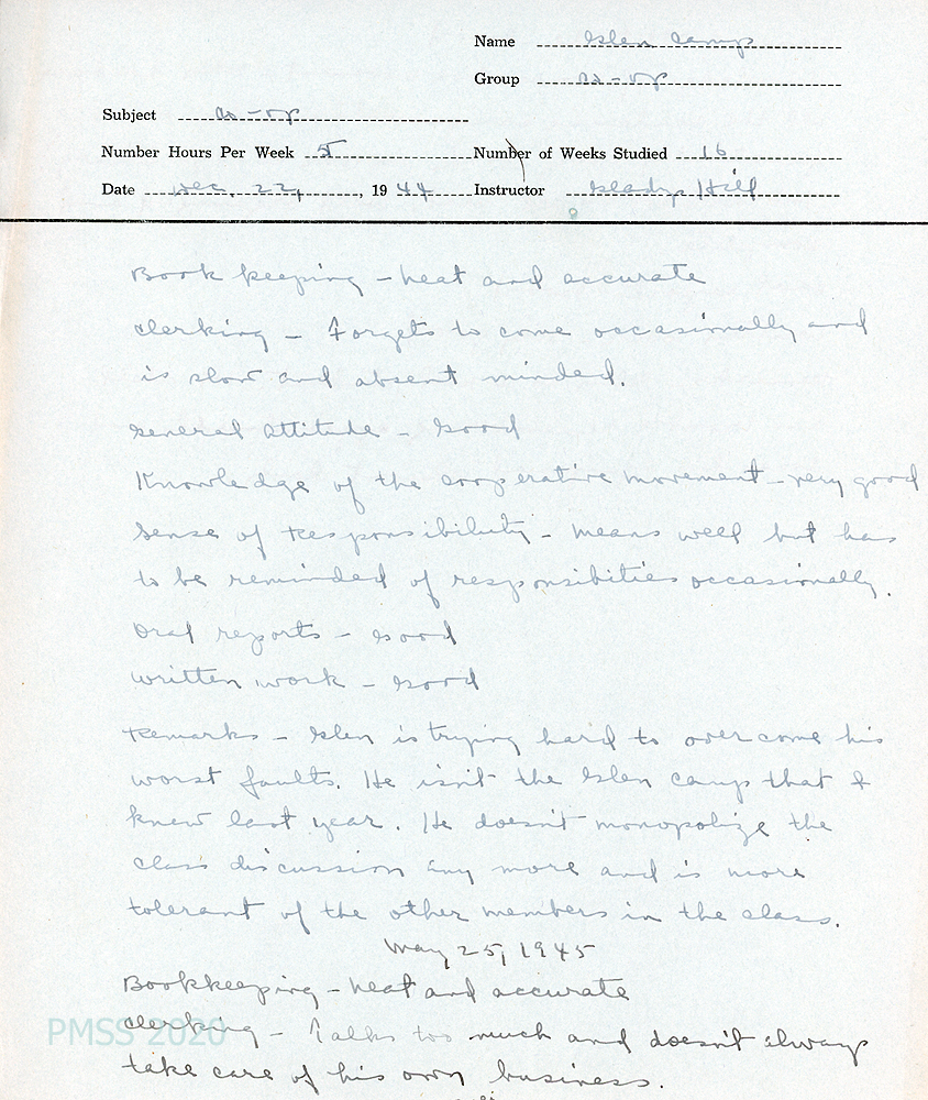 [036] May 25, 1945. Student appraisal by housemother, Josephine Merrill.