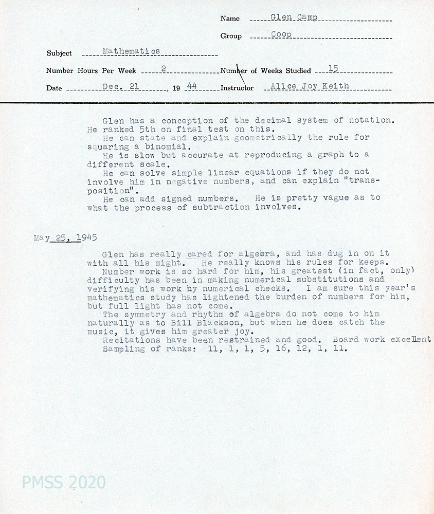 [034] December 21, 1944, and May 25, 1945. Student evaluation by Mathematics teacher, Alice Joy Keith.